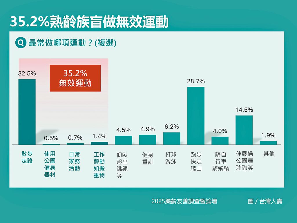 你做對運動了嗎?中國信託金融控股公司子公司台灣人壽保險股份有限公司(簡稱「台灣人壽」)攜手遠見雜誌共同發布2025「樂齡友善調查」,結果顯示逾三成40歲以上熟齡族很少或從不運動;即使是愛「動」族,仍有35.2%僅做散步、走路等無效運動,甚至把家務或工作勞動當成運動,顯示民眾對正確運動認知不足,老後健康可能危「肌」四伏。