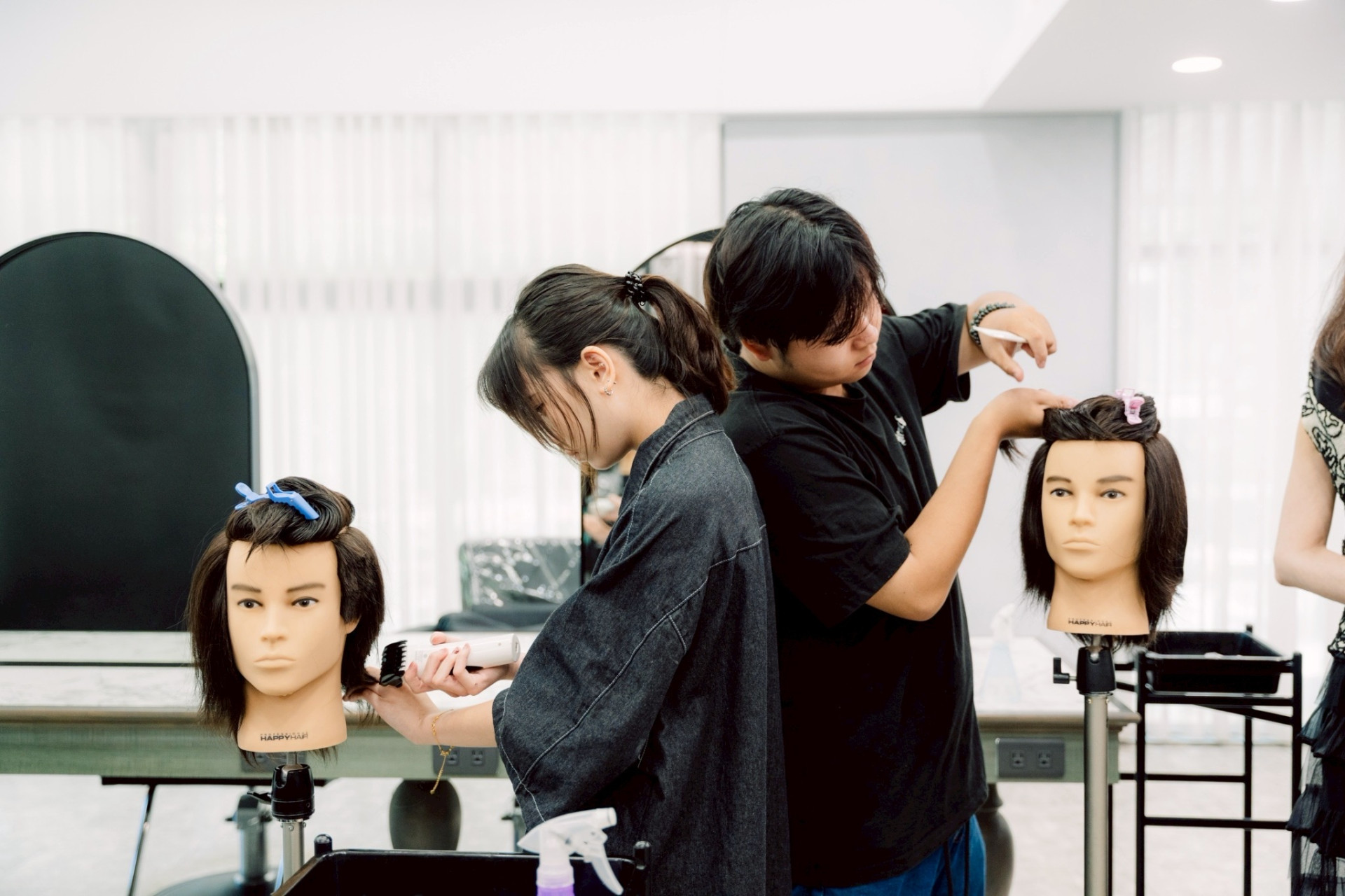 8月19日於快樂麗康GENIC竹北店舉辦的研習課程,由資深美髮設計師團隊擔綱指導,課程主題聚焦於「韓流男式剪染潮設計」,內容涵蓋染髮實務、推剪技巧及潮流吹整造型演練。學生們在專業講師的引領下,進行實際操作與互動交流,透過職場實境體驗,累積產業第一線的專業技術與經驗。