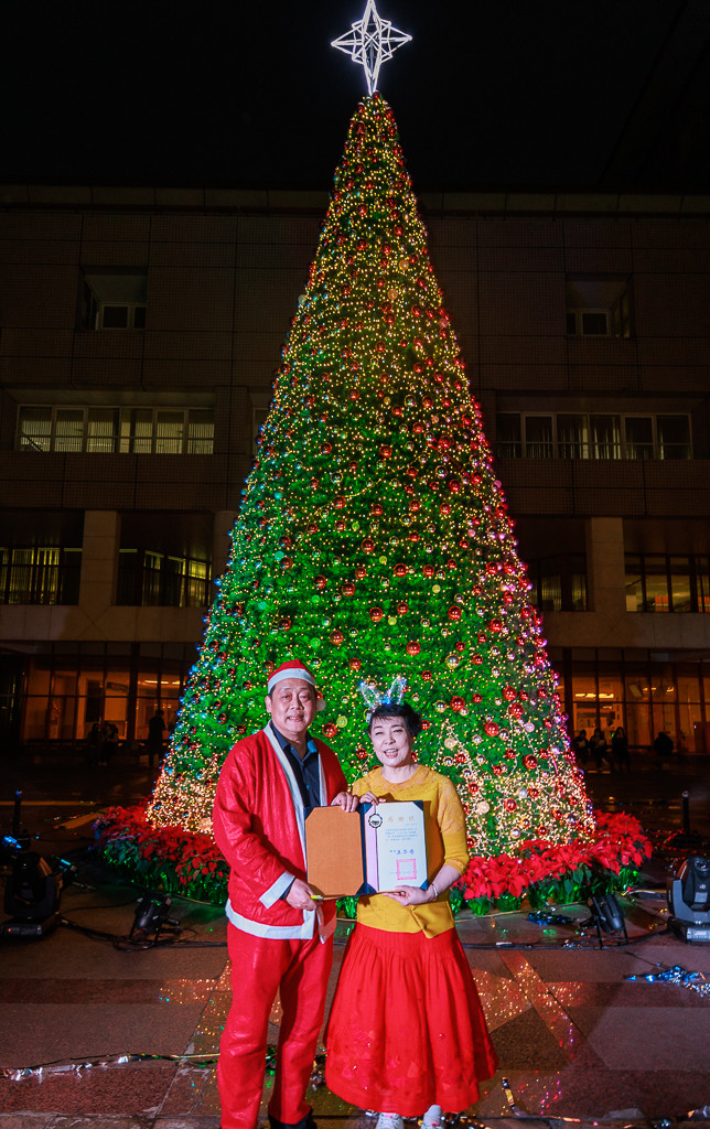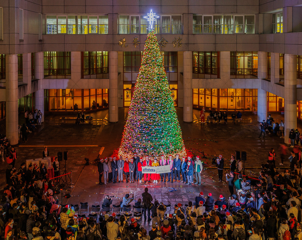 迎接耶誕歡慶,中國文化大學於今(12/13)舉辦「2023愛在最高點-文大聖誕點燈祈福儀式」,由億光智能科技捐贈12米高的聖誕樹,它不僅是全臺海拔最高的校園聖誕樹,也是創校六十年來首度有大型聖誕樹矗立圖書館前,吸引許多師生及遊客駐留欣賞,讓座落於最高學府的文大校園更加繽紛華麗及溫馨的氛圍。