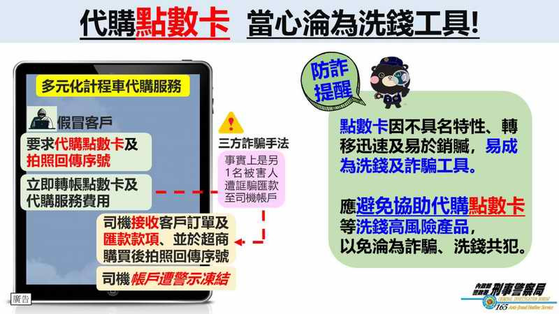 因點數卡具有不記名性、轉移迅速、易於銷贓等特性,詐騙集團常把點數卡當成洗錢及詐騙工具,刑事局呼籲民眾,協助代購點數卡可能遭利用為洗錢,建議提供代買、代購服務之業者,亦應避免代購點數卡等易被利用於洗錢的高風險產品,以免讓自己陷入詐欺、洗錢不法共犯的窘境,民眾有任何疑問歡迎撥打165反詐騙諮詢專線查詢。