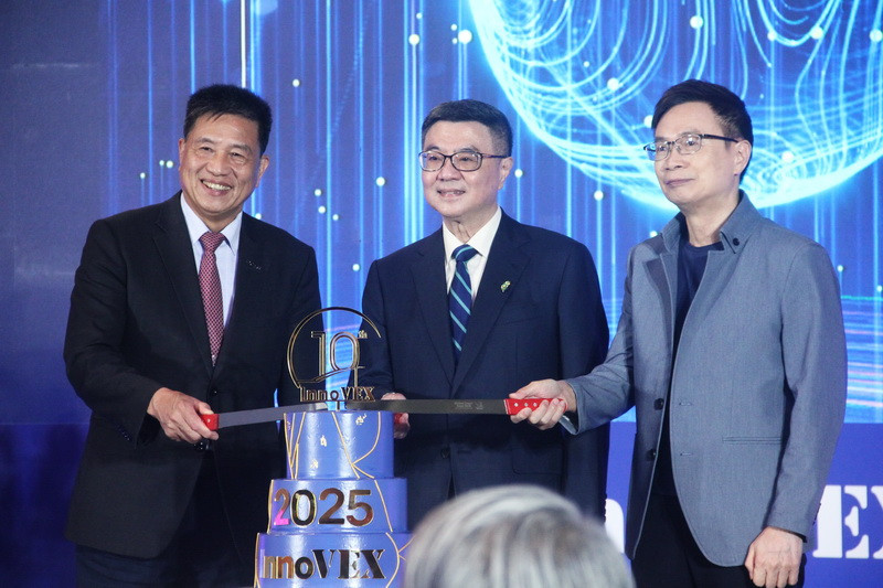 InnoVEX 2025由外貿協會董事長黃志芳(右起)、行政院長卓榮泰、台北市電腦公會理事長彭双浪揭開序幕。