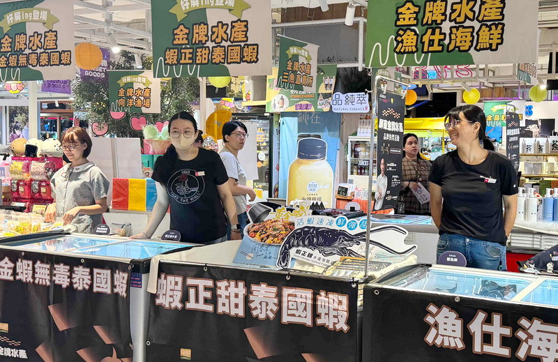 屏東金牌水產品牌快閃活動現場展出龍膽石斑、泰國蝦等優質水產。