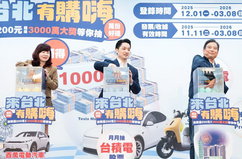「來台北有購嗨!」活動於12月18日抽出「月月抽」首批幸運得主,包括台積電股票一張、君悅101跨年煙火總統套房與LUXGEN n7電動車等超值大獎;活動迄今累積登錄金額將逾10億元,北市府除宣布加碼抽美國雙人來回機票外,只要民眾於耶誕至跨年的歡樂節慶期間消費(114年12月24日至115年1月1日),抽獎機會再翻倍,歡迎民眾把握耶誕佳節前往北市遊逛,讓北市創造你的幸運、放大你的幸福。