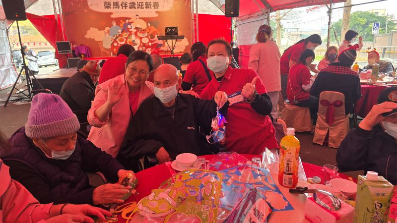 今天的圍爐活動流程緊湊而熱鬧,從志工陪同長輩參與「馬力全開大挑戰」互動遊戲,到樂團老師與長輩合唱經典歌曲,現場氣氛熱烈。台積電慈善基金會董事長張淑芬更逐桌與長輩互動,讓圍爐不只是用餐,更是一場充滿情感連結的相聚時刻。志工們協助長輩書寫專屬名牌、完成馬年紙雕DIY,藉此增加互動與交流,讓每一位長輩都能在安心、愉快的氛圍中參與活動。