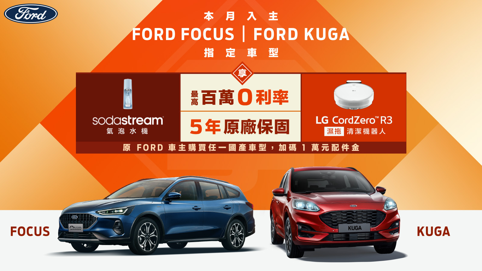 2023年12月30日至2024年1月31日止 - 入主EcoBoost®180車型享最高100萬0利率、5年原廠保固(3年原廠保固+2年加值型延長保固)再贈「LG CordZero™R3 濕拖清潔機器人」。 - 入主EcoBoost®250 AWD車型享最高100萬0利率、5年原廠保固(3年原廠保固+2年加值型延長保固)再贈「LG CordZero™R3 濕拖清潔機器人」及「SodaStream TERRA 快扣機型氣泡水機」。 - 原Ford車主換購全車系可享1萬元配件金。 |