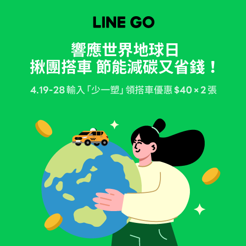 | LINE GO | 4.18-4.28輸入優惠碼「少一塑」,領搭車優惠40元*2張。 |