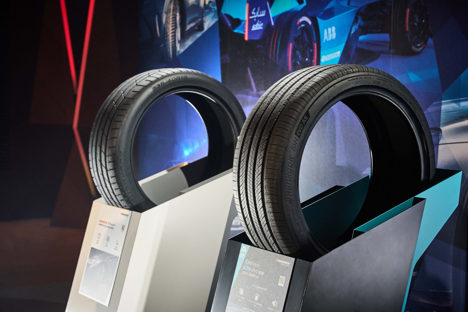 現場展示:左-高性能胎 及 右-電動車胎。