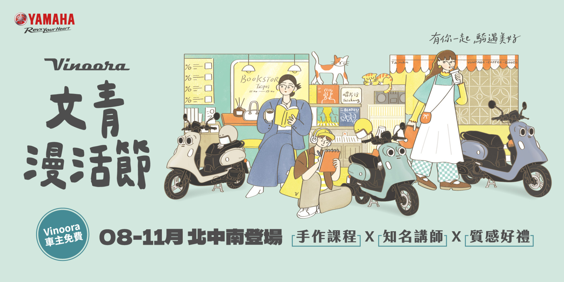 今年,跟著 「Vinoora」一起漫活各地吧 ! 台灣山葉機車攜手生活風格品牌「EVERYDAY OBJECT」於2024年打造「Vinoora 文青漫活節」,將為大家的日常騎行獻上美好盛會,敬邀各地朋友參與這場專屬於「Vinoora」文青人士的漫活之旅。