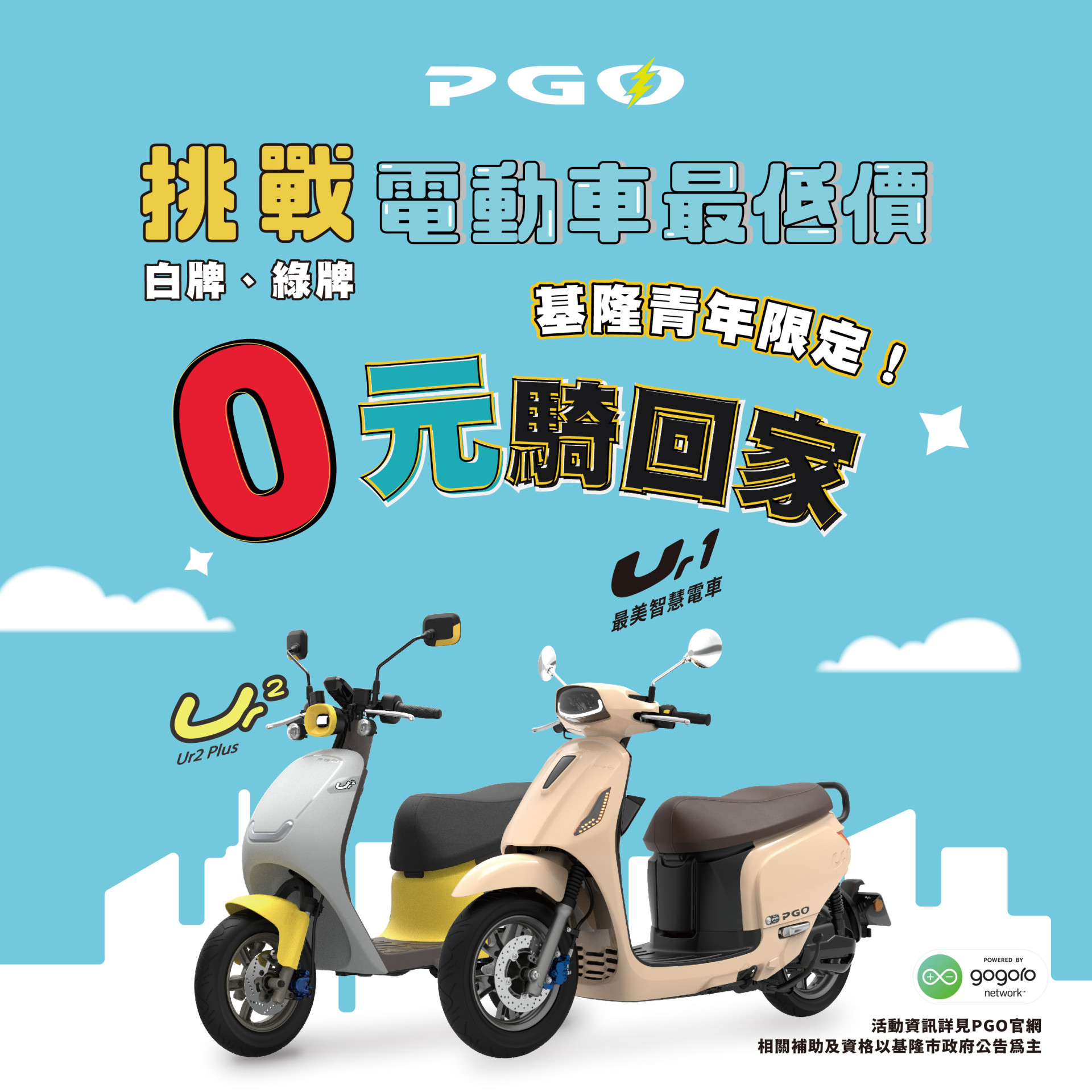 挑戰電動車最低價!基隆青年限定!PGO 電動車零元騎回家!響應政府綠色交通政策,協助青年就業與交通自主,基隆市114年公益青年就業電動機車補助計畫正式啟動!凡符合資格的基隆青年,每月1日開放申請,現在就有機會申請最高6萬元補助金,0元就能把PGO電動機車騎回家!