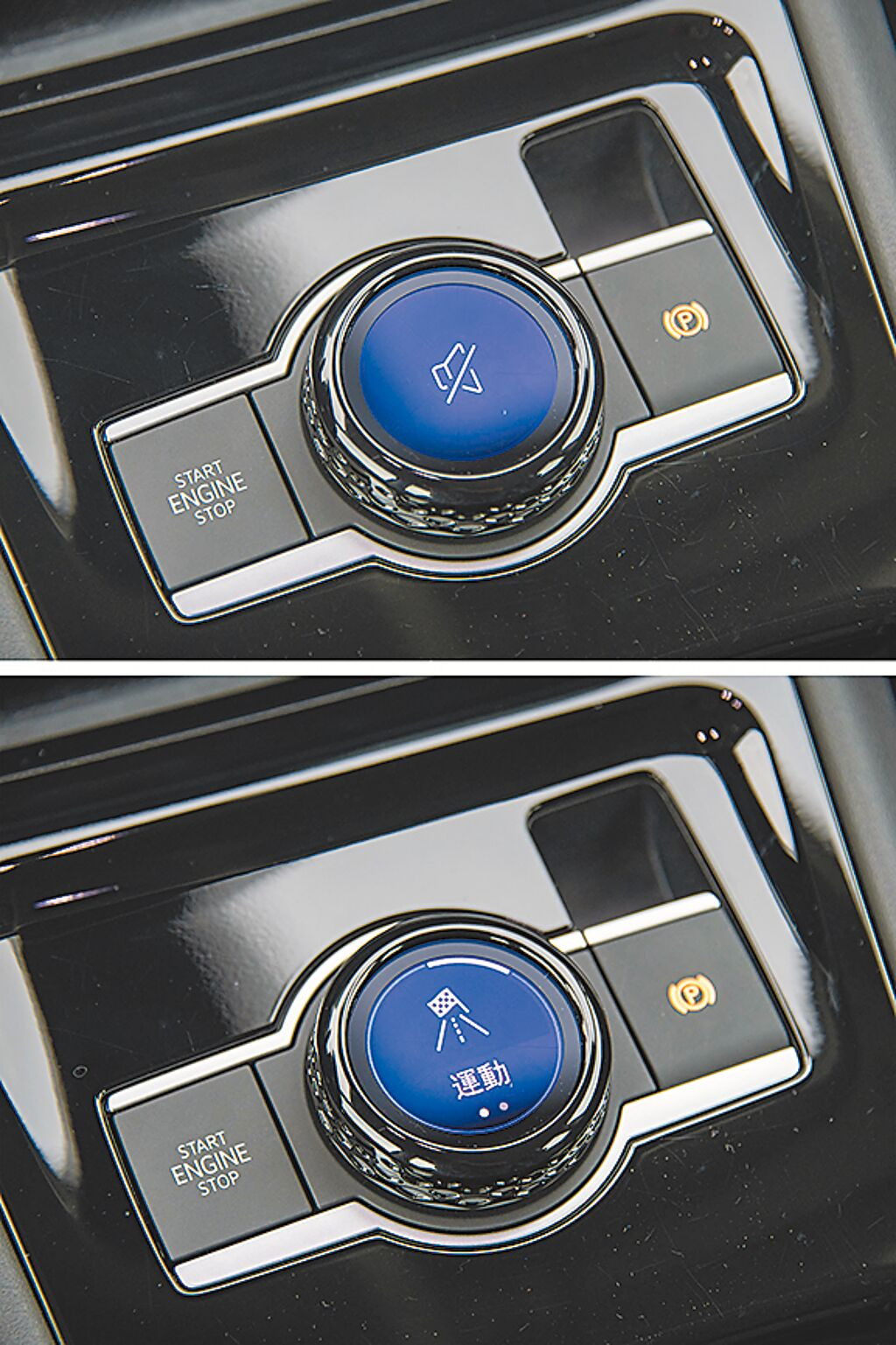 中央數位控制旋鈕可藉由按壓、旋轉與滑動面板螢幕來切換如音量(上)、駕駛模式(下)等不同功能。(陳大任攝)
