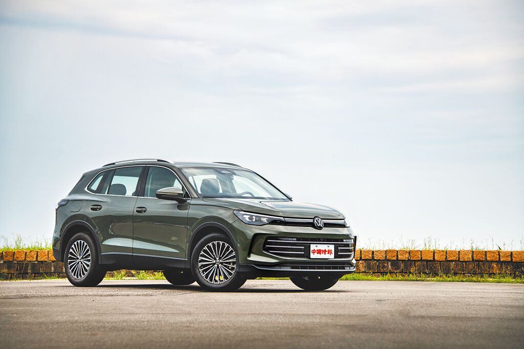 全新Tiguan 280 eTSI Elegance Premium為車系最熱銷的主流車款,車頭採用與車身同色前保桿,並搭配橫柵式鍍鉻飾條及LED貫穿式定位燈,其他包括18吋Napoli鋁圈、炫銀車頂行李架,予人優雅內歛又不失運動感的視覺效果。(陳大任攝)