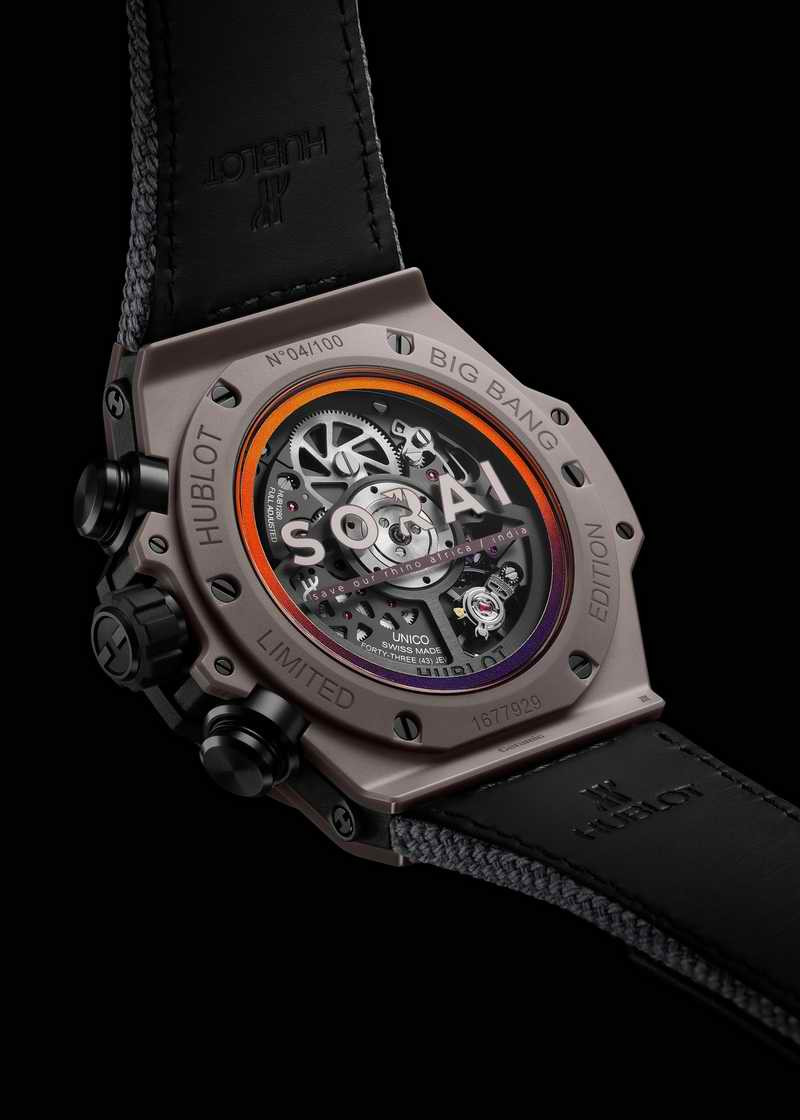 Big Bang Unico SORAI犀牛灰限量錶直徑44毫米,錶殼採用特殊微噴砂犀牛灰的陶瓷材質,鏤空錶盤整體呈現非洲大地落日餘暉的天空多樣色彩,包括黃色、橙色、紫色和粉色,代表著黎明帶來的無限希望,位於9點鐘的醒目橘色犀牛造型,提醒我們保育犀牛刻不容緩。搭載Unico自製自動上鏈飛返計時機芯,提供72小時動力儲存。延伸自錶殼與錶盤的繽紛迷彩與灰色兩款複合材質錶帶,風格各有不同,而迷彩錶帶以特製硫化橡膠技術,確保錶帶的色澤圖案可以持久如新,完美繪製出的線條精緻度達1/10毫米,這項技術也是製錶業首創。透過“One Click”單鍵快拆錶帶裝置,可輕易搭配造型更換錶帶。