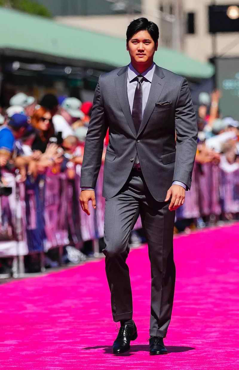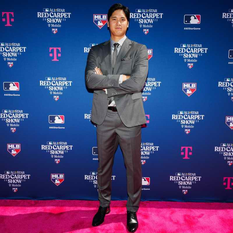 於西雅圖舉行的大聯盟明星賽賽前紅毯,超人氣球星大谷翔平身穿BOSS深灰色合身西裝搭配同色領帶與淺灰色襯衫,造型別緻帥氣。 他穿著 BOSS ONE THE SU1T,這是一套經典 BOSS 西裝套裝,結合了完美工藝、精準剪裁的合身性和極致的行動自由度。