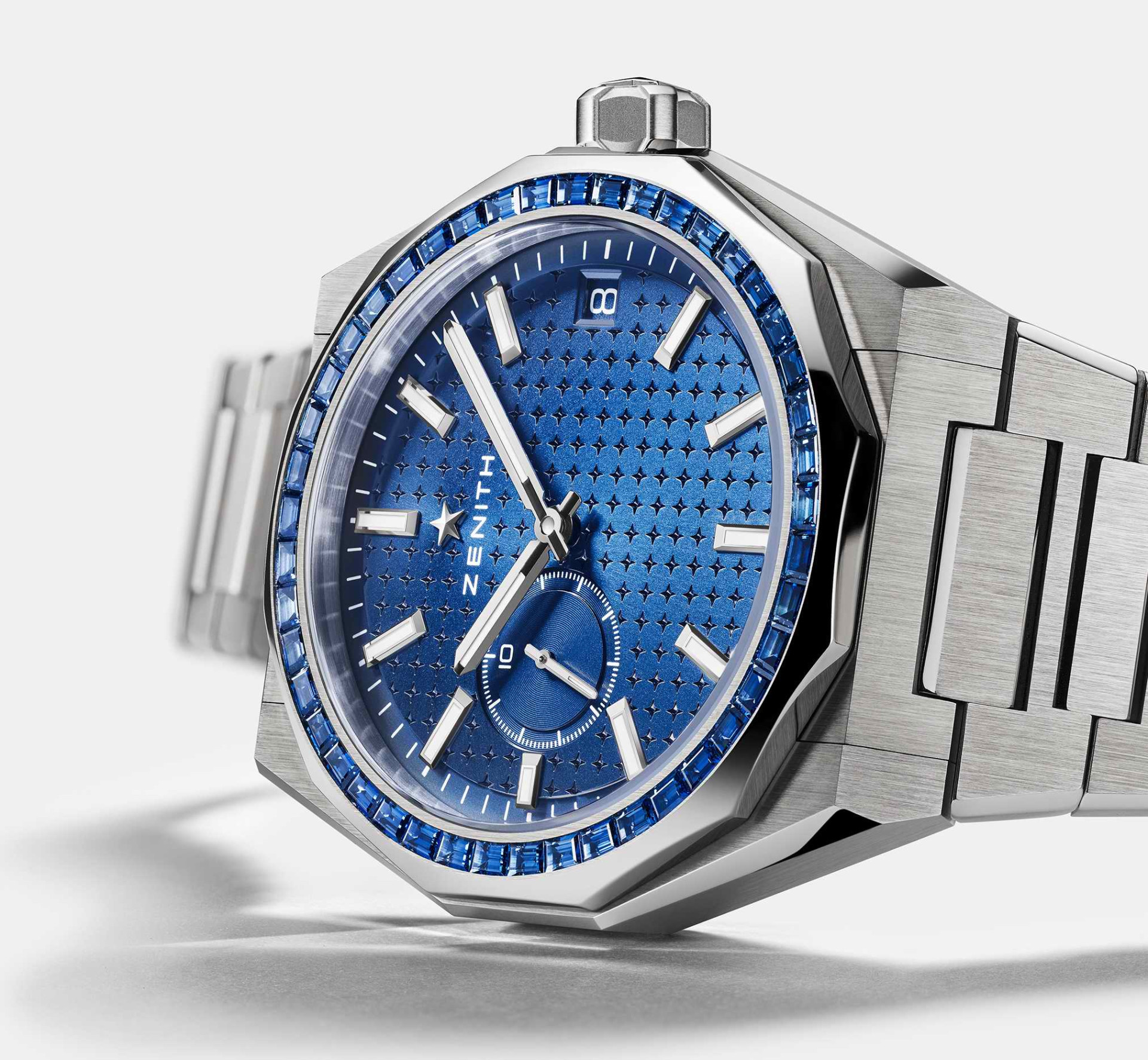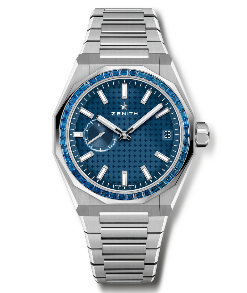 DEFY Skyline腕錶透過現代手法詮釋Zenith真力時於1969年推出的首款ZENITH DEFY腕錶,並以大膽的建築線條和堅固性能這兩大系列特色,完美融合過去與現在。以星空為靈感的深藍色調已成為眾多Zenith真力時專賣店限定款式腕錶的標誌,而DEFY Skyline Sapphire天際線系列藍寶石腕錶則以璀璨的寶石鑲嵌設計加倍彰顯其動人魅力。精鋼十二邊形錶圈鑲嵌45顆長方形切割藍色藍寶石,進一步點綴金屬藍色錶盤上的四芒星幾何圖案。腕錶隨附一體式精鋼錶鏈和一條藍色星空圖案橡膠錶帶,可在無需使用任何工具的情況下透過錶殼上精妙的錶帶快速更換系統進行替換。