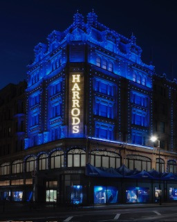 日落後,哈洛德百貨的外牆將被騎士藍燈光所照亮,此為首席創意總監Daniel Lee為Burberry設計的