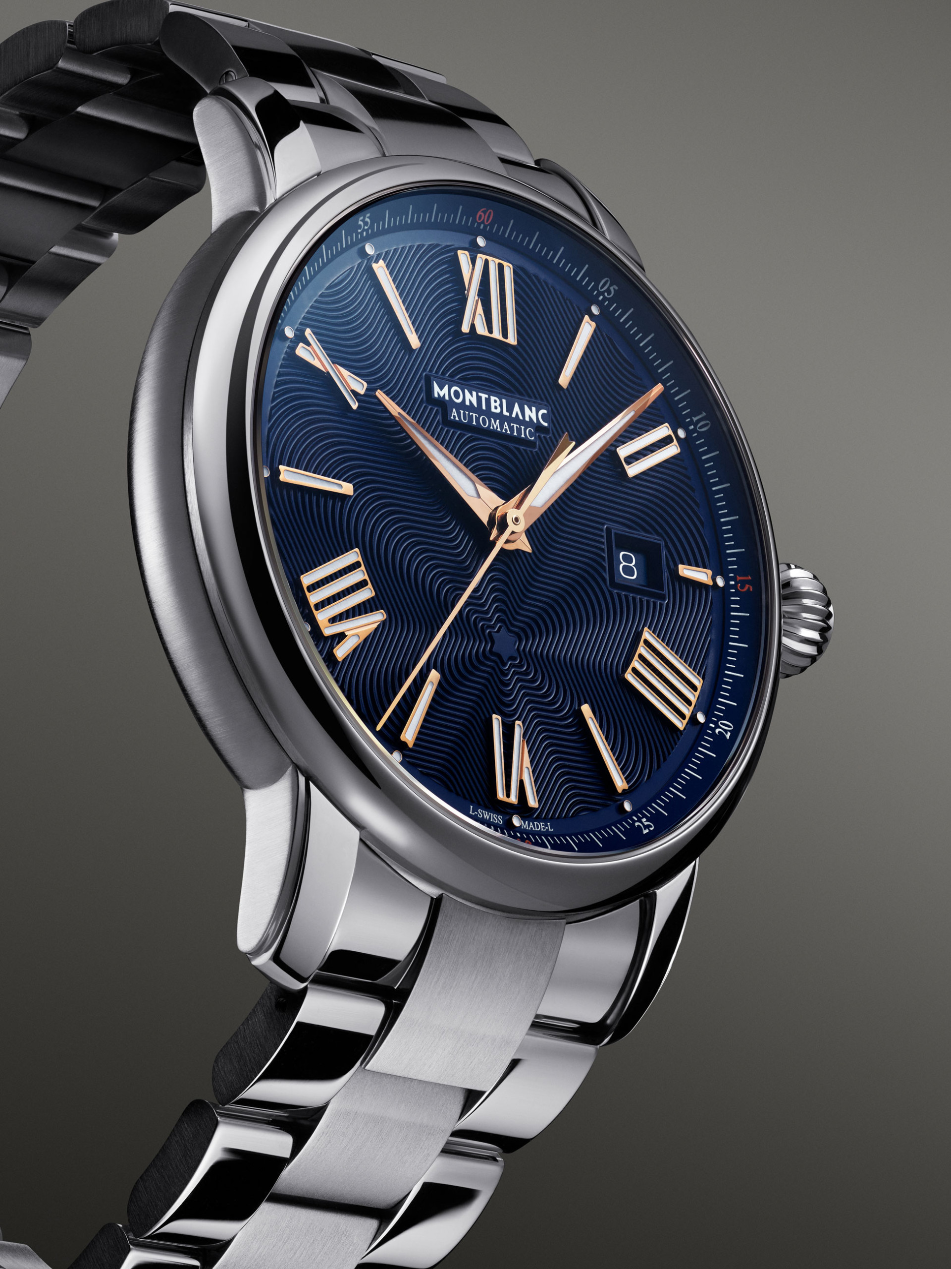獨特的藍色錶盤搭配鍍玫瑰金指針及數字,搭載MB 24.17自動機芯,可提供長達38小時的動力儲存,可顯示時、分、秒和日期,並呈現鮮明的色彩對比。此款腕錶的分鐘刻度以5分鐘間隔的小型夜光圓點與15分鐘間隔的橘色圓點標示。