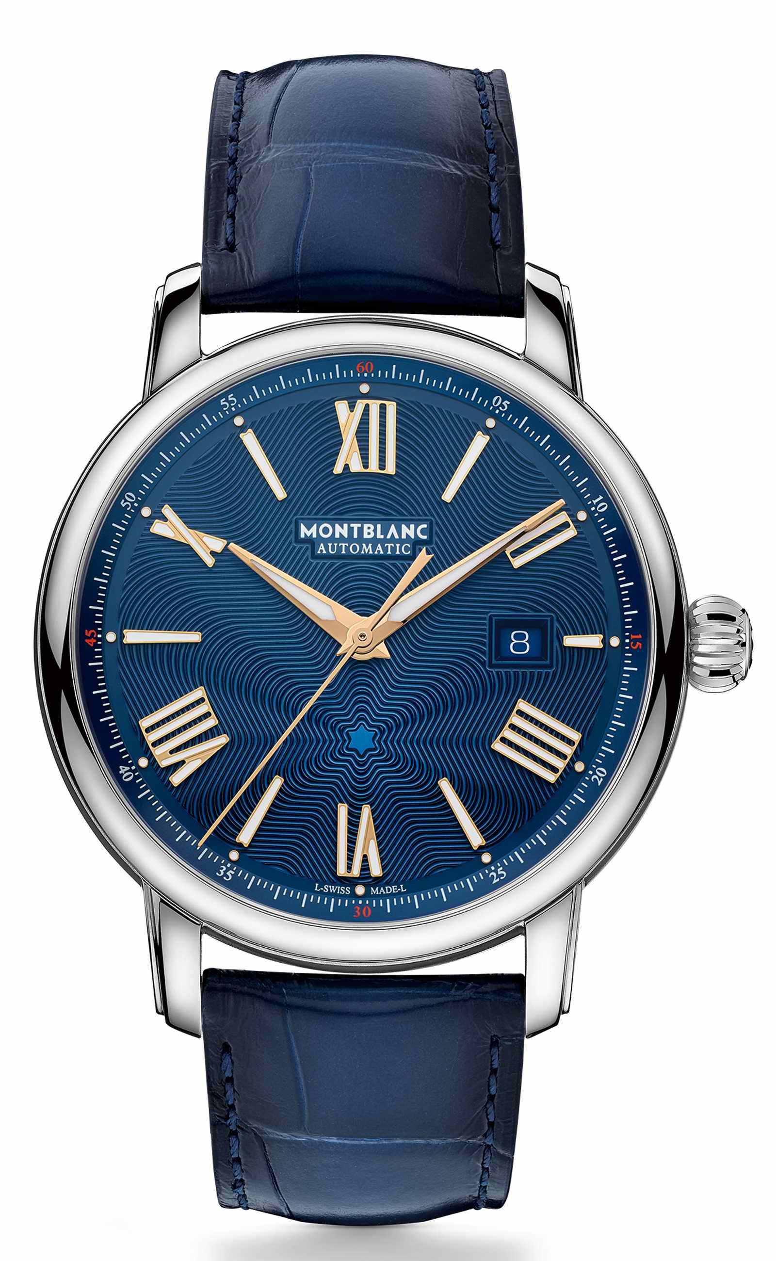 兩款腕錶防水性能均高達5巴(約50公尺),並配備MONTBLANC的可替換錶帶系統,可選擇精鋼錶鍊或鱷魚皮紋搭配同色系縫線的藍色小牛皮錶帶。