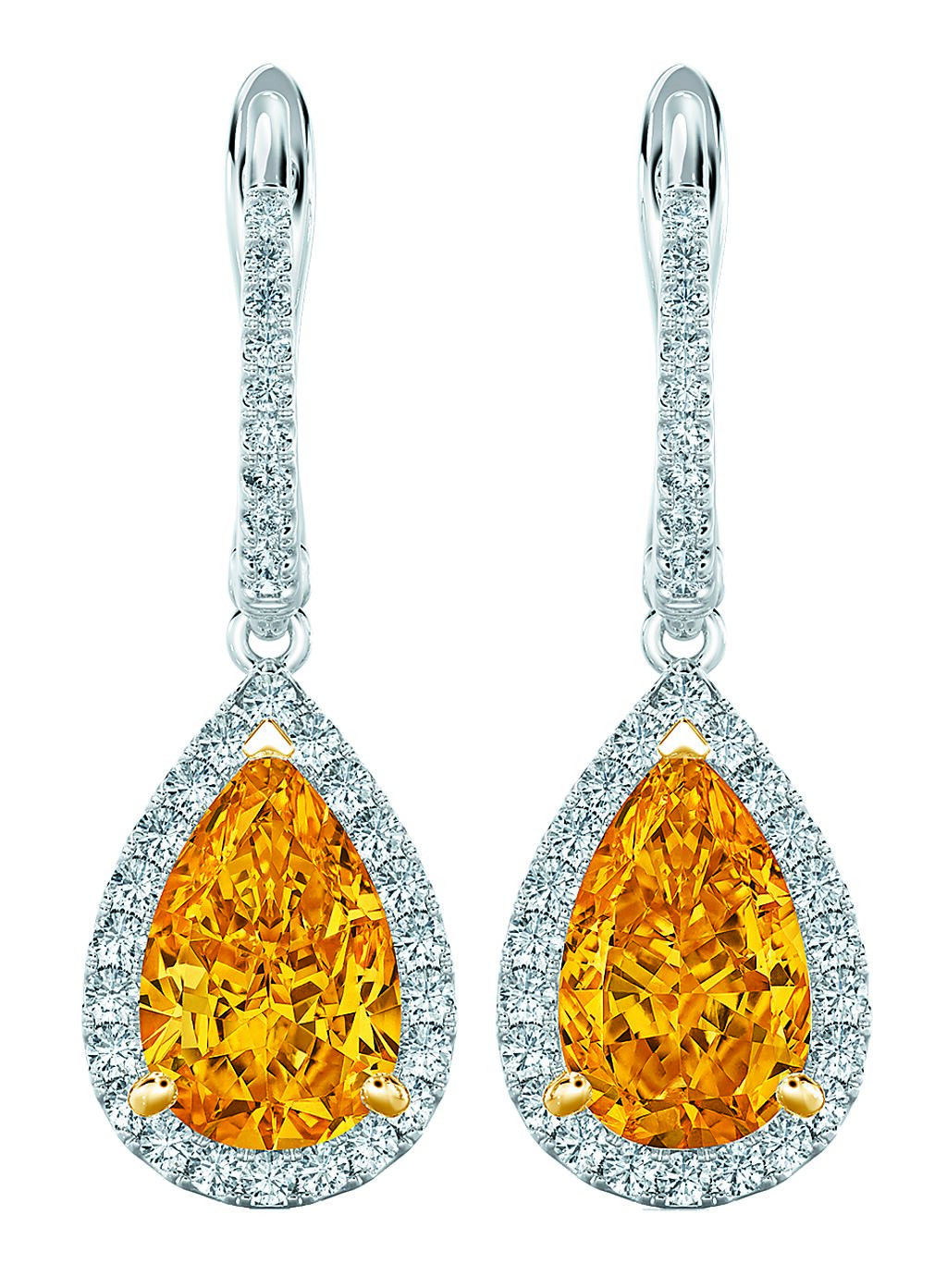 De Beers Aura梨形切割橘鑽耳環,主石為兩顆各逾1克拉橘鑽。(De Beers提供)