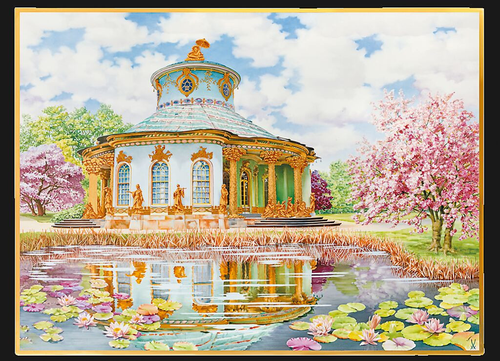 另一幅引人入勝的壁畫是比吉特格雷斯Birgit Greiss創作的「無憂宮的東方情懷」,將普魯士國王腓特烈大帝位於波茨坦「無憂宮」花園裡的「中國茶樓」移到瓷畫裡,紀錄18世紀歐洲對中國文化的嚮往。