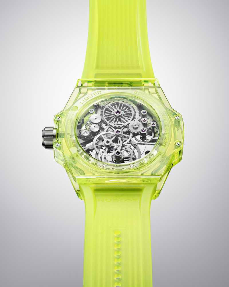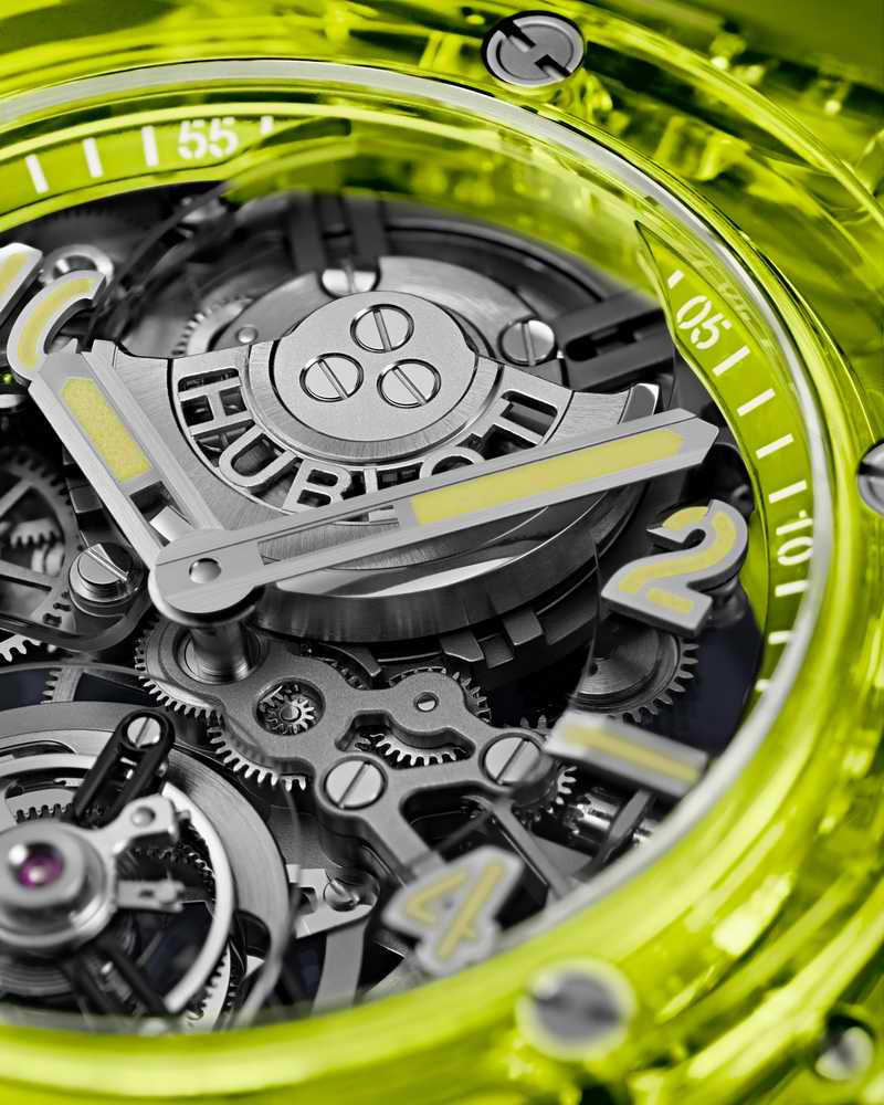 Big Bang陀飛輪螢光黃SAXEM腕錶以前衛的材質研發技術與精湛的製錶工藝結合,打造出44毫米的錶殼。此錶殼由航太工業的特殊材質SAXEM製成,內部搭載自製的HUB6035自動上鏈陀飛輪鏤空機芯,擁有72小時動能儲存與防水30米的優異性能。其時尚搶眼的螢光黃色系,展現了宇舶錶在研發製造前衛潮流高階複雜腕錶方面的硬實力,傳遞出獨一無二的時尚科技感。全球限量50只,讓其成為收藏家的夢幻逸品。