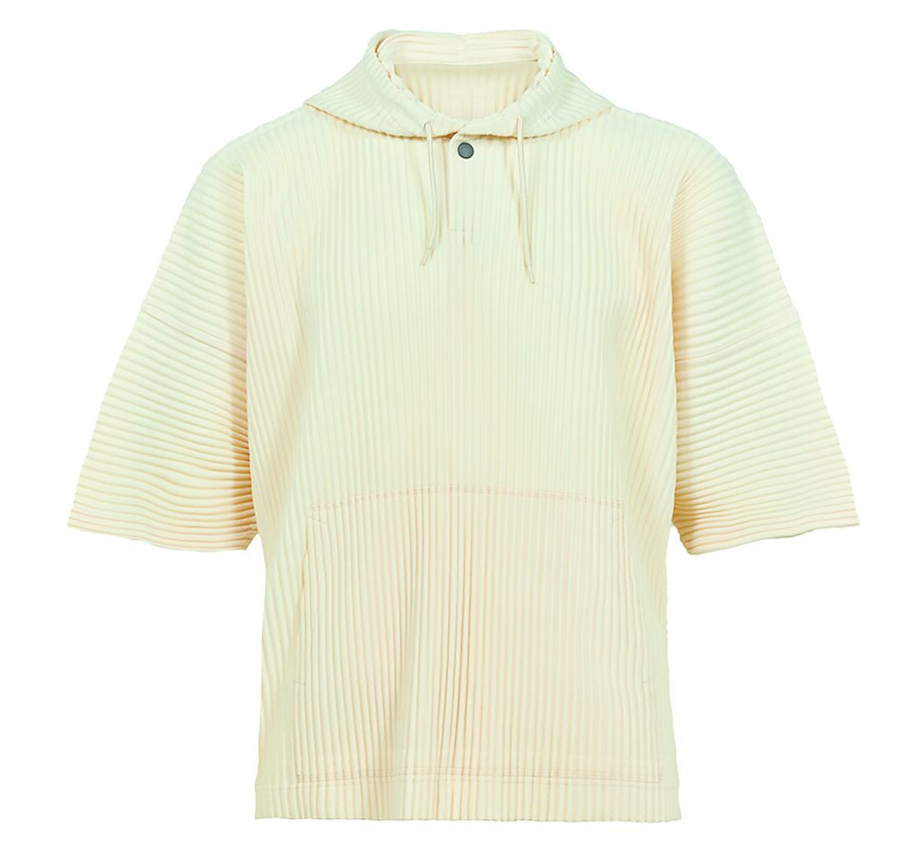 HOMME PLISSE ISSEY MIYAKE六月季節色香草白連帽五分袖上衣,1萬4300元。(君梵提供)