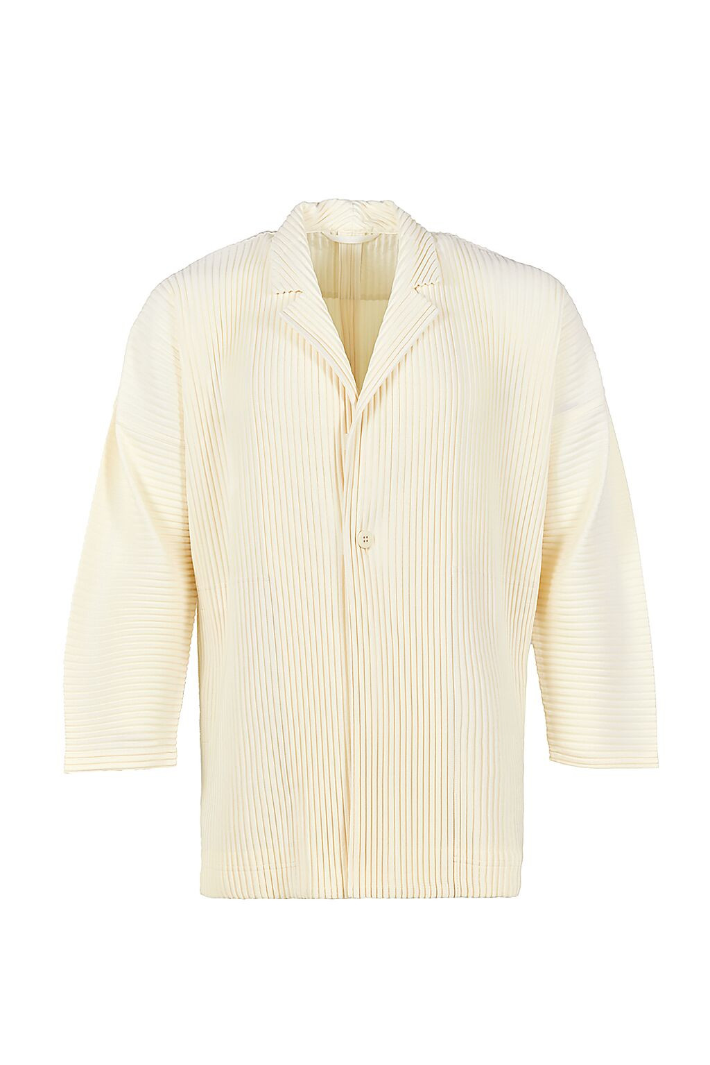 HOMME PLISSE ISSEY MIYAKE六月季節色香草白西裝夾克,售價2萬2800元。(君梵提供)