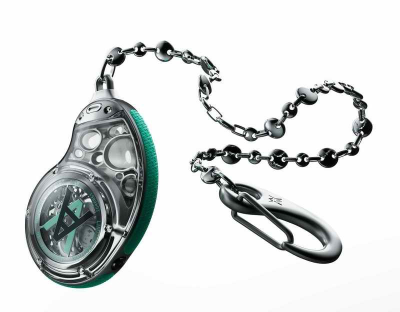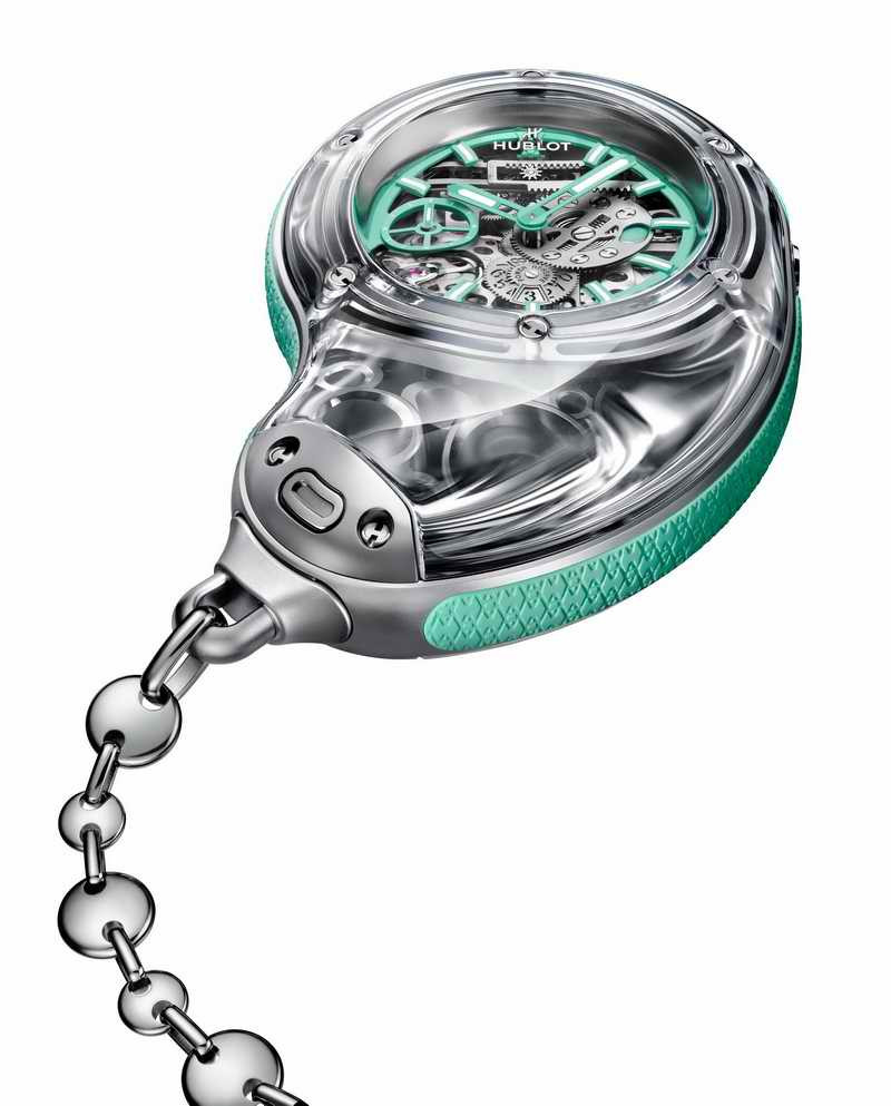 宇舶Arsham Droplet 鈦晶懷錶長7.3公分,寬5.3公分,厚2.3公分,沿著錶殼側邊包覆著特製Daniel Arsham標誌綠色橡膠防滑裝置,符合人體工學原理的觸感設計,使其能與手掌理想貼合,彷彿時間在指尖流轉,為佩戴者帶來沉浸式的佩戴體驗。以鈦金屬材質匠心打造的鏤空錶殼,採用“三明治”結構,搭配兩塊工藝精湛的弧形水滴造型錶鏡,採用雙密封系統,並巧妙配備超過17個的O型密封圈,具備30米防水性能。宇舶標誌性的六顆H形螺絲,依舊在錶款上堅固串聯立體錶殼。無論身處任何環境,都能確保其非凡的耐用性和可靠性。
