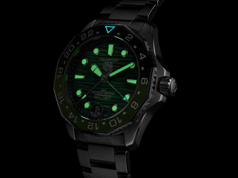 TAG Heuer Aquaracer Professional 300 GMT 腕錶是專為現代探險家所設計,具備多功能與堅固耐用的特性。這款腕錶備有 GMT 功能,準備好帶領佩戴者跨越海洋及時區。此款 GMT 腕錶的藍黑或綠黑配色反映了天空、陸地和海洋的元素。雙色錶圈採用抗磨防刮陶瓷材質,鐫刻有 24 小時 GMT 刻度,讓佩戴者一眼就能辨別白天和黑夜。GMT 指針採用藍色或綠色漆面,配以夜光塗層,增添了功能性與大膽顯眼的風格。