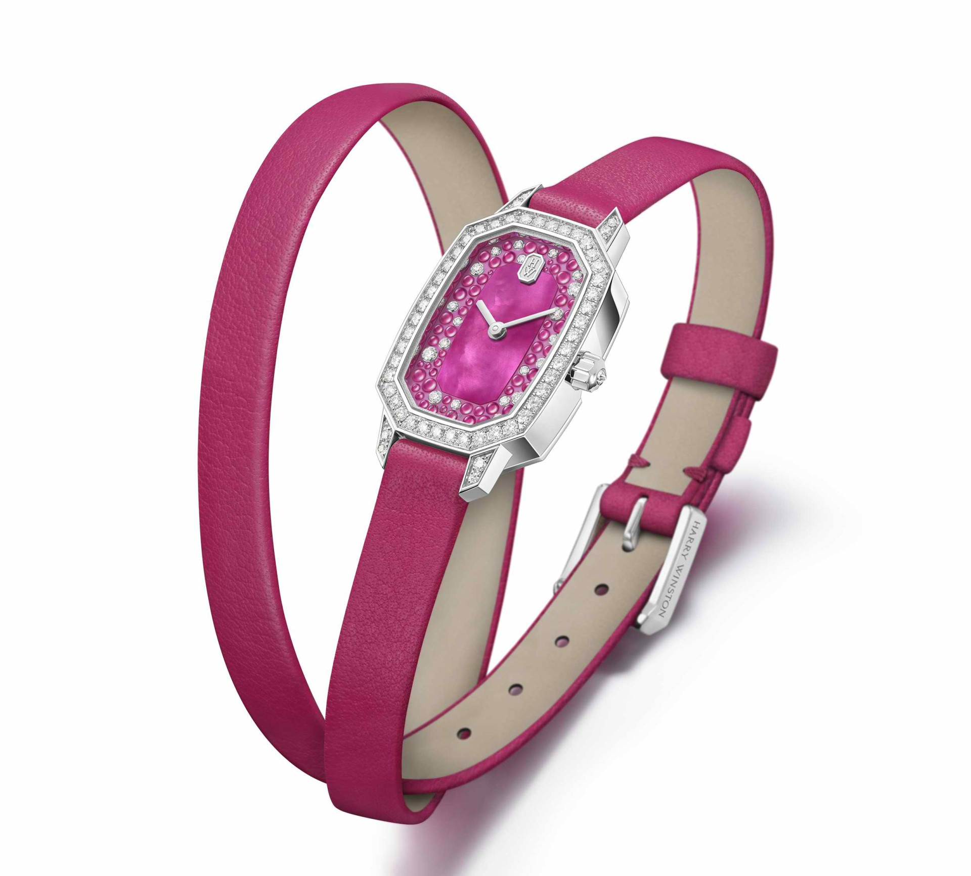糖果粉色錶盤的18K白金錶款具有極高的辨識度,大小不一的蛋面切工珍珠母貝和20顆圓形明亮式切工的鑽石宛若氣泡在內圈閃耀,以漂亮的虹彩粉色珍珠母貝構成八角形的中心。12點鐘位置則採用18K白金打造的標誌性祖母綠型切工品牌標識,與同為18K白金的錶盤相互輝映。
