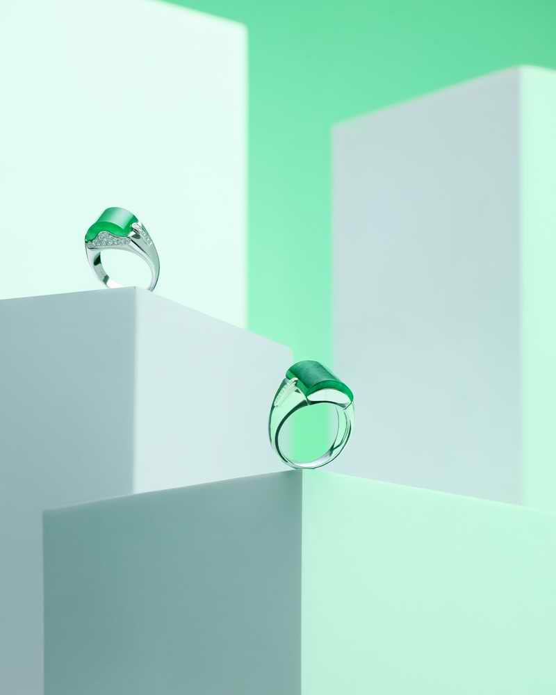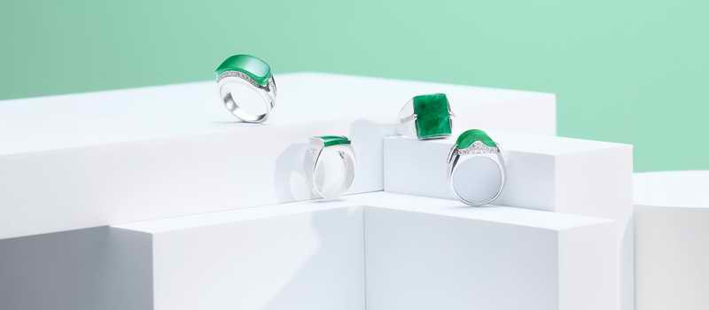 此系列寬版戒指,既有都會時尚的現代感,盎然綠意,捎來朗朗清新的氣息,主石的形制,亦含蘊東方情味,鞍形、橋拱乃至方長造型,特別能引人感受時代的氛圍,那種深深長長、溫厚又儒雅的經典風範。