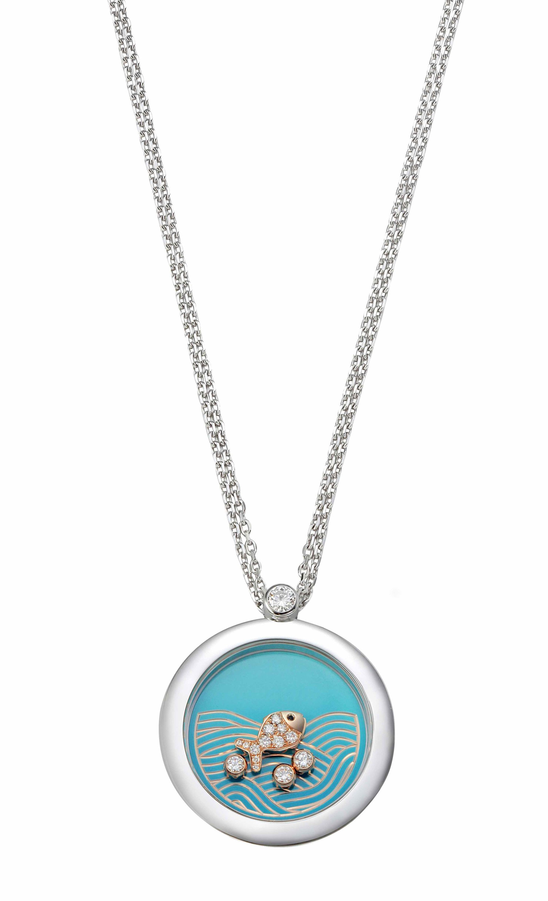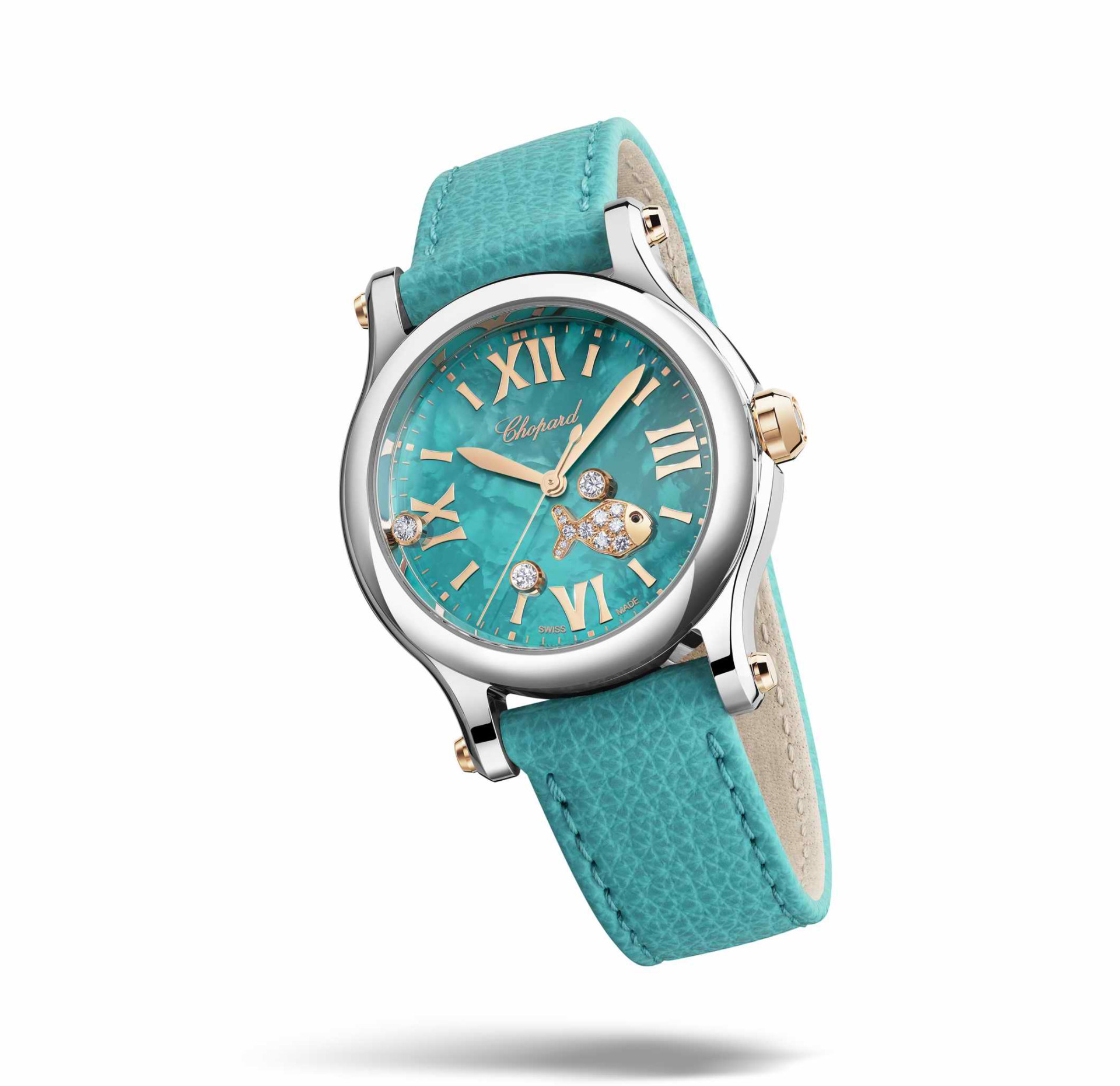 Happy Fish腕錶推出全新綠松石款式,36毫米錶殼採用Lucent Steel™材質,並以玫瑰金錶冠、錶冠裝飾石及玫瑰金色指針與時標點綴。腕錶透過海藍色漸層的金質錶盤,經由PVD處理呈現出宛如晨光穿透海面的光影層次,搭配細緻刻劃的海浪線條,隱隱透出底層營造如置身深海般的沉靜氛圍,流轉出光與水交織的視覺美感。精緻明亮且清新的綠松石色珍珠母貝錶盤,讓人聯想到充滿白沙與美麗綠松石海浪的夏日假期。三顆滑動鑽石與一隻鑲鑽游動小魚在綠松石錶盤上熠熠生輝。腕錶與項鍊相互呼應,疊搭外更為夏日造型注入一抹藍色靈感,在清爽清涼的色調中展現優雅與鮮明個性。