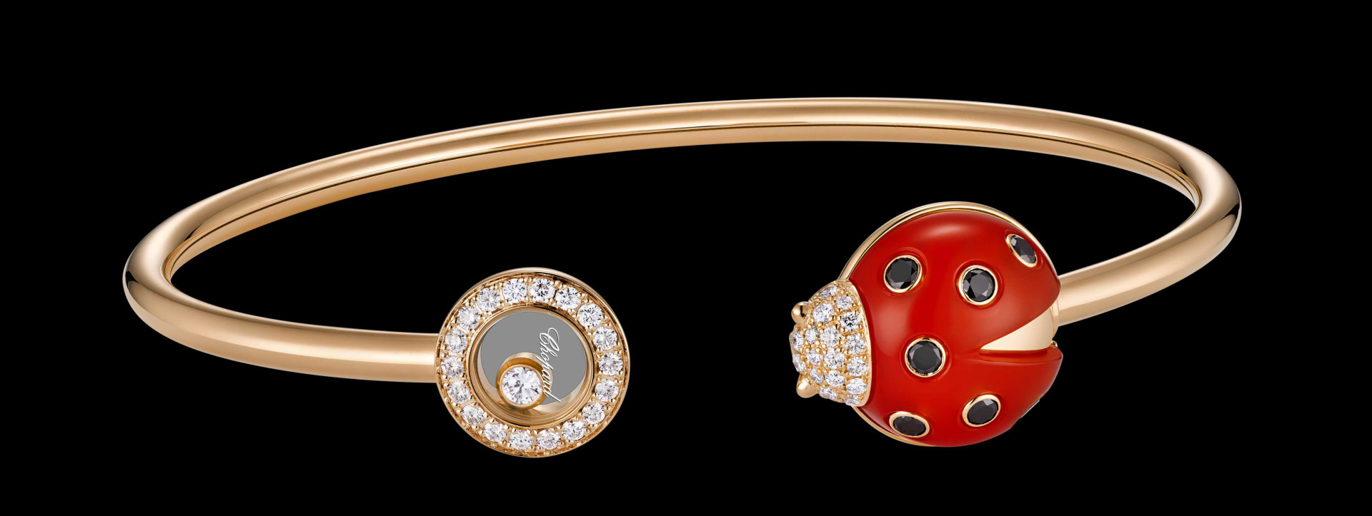 Happy Diamonds系列從首創滑動鑽石的輕盈律動,到揉合象徵意涵與造型美感的全新設計,此系列始終散發著歡愉與純真的氣息。瓢蟲與蝴蝶兩款全新手鐲作品,各自承載獨特寓意。瓢蟲作為精巧的幸運象徵,長久以來不僅為腕錶設計注入靈感,如配備隱秘保護蓋的腕錶與飾有鉸接式翅膀的小型座鐘。此次推出的手鐲,採用符合倫理標準的18K玫瑰金鑲嵌紅玉髓與黑白鑽石,搭配滑動鑽石點綴,動感十足。蝴蝶手鐲同樣採用符合倫理標準的18K玫瑰金,搭配天藍色玉髓與鑽石蝴蝶造型。蝴蝶象徵蛻變與輕盈,寓意飛翔、希望與嶄新的氣象。手鐲點綴一顆滑動鑽石,輕巧流轉展現生命的輕柔律動。
