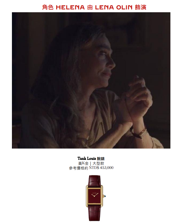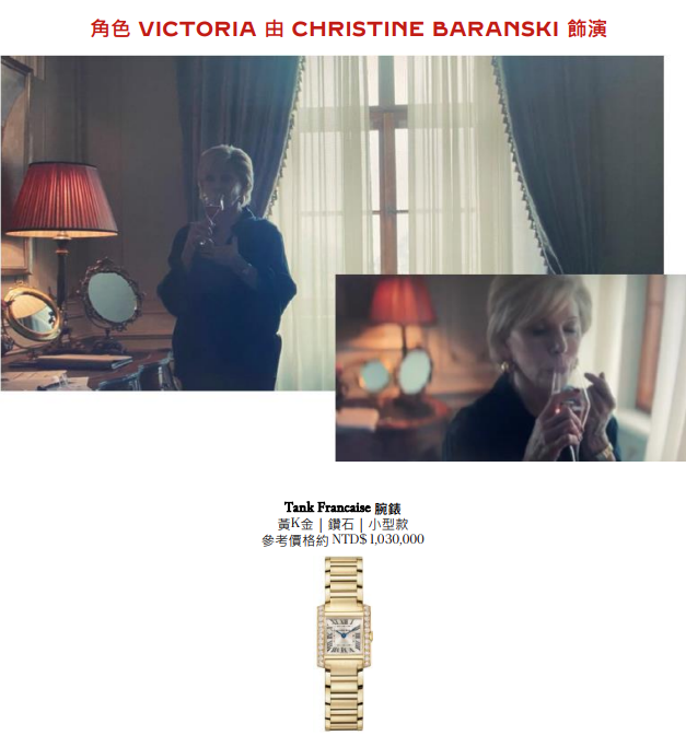 在Prime Video影集妮可·基嫚領銜主演的《九位完美陌生人》第二季劇中,Helena(LENA OLIN飾演)在劇中配戴 Tank Louis Cartier 腕錶以及Victoria(CHRISTINE BARANSKI 飾演)配戴 Tank Française 腕錶。