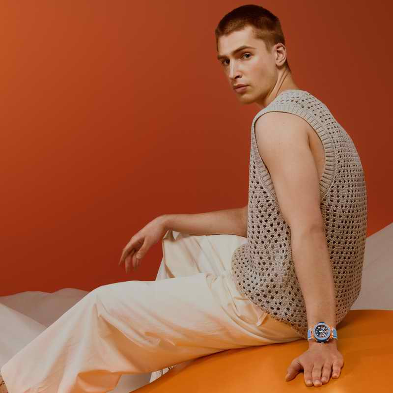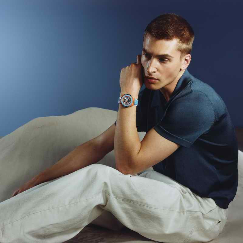 整體設計在鮮明對比中展現細膩平衡,深藍色的錶耳與鏤空面盤下層底板彼此呼應,為高飽和色調注入一抹沉穩節奏,構築出屬於盛夏的視覺和諧。細節之處同樣精緻出色:橘色外圈秒鐘刻度圈與雙眼計時盤邊框帶來視覺節奏與動感;白色時標與指針則強化清晰辨讀性,並烘托整體的運動風格與鮮明識別度。從外觀延伸至機芯結構,傳遞品牌對製錶工藝與美學的極致追求。