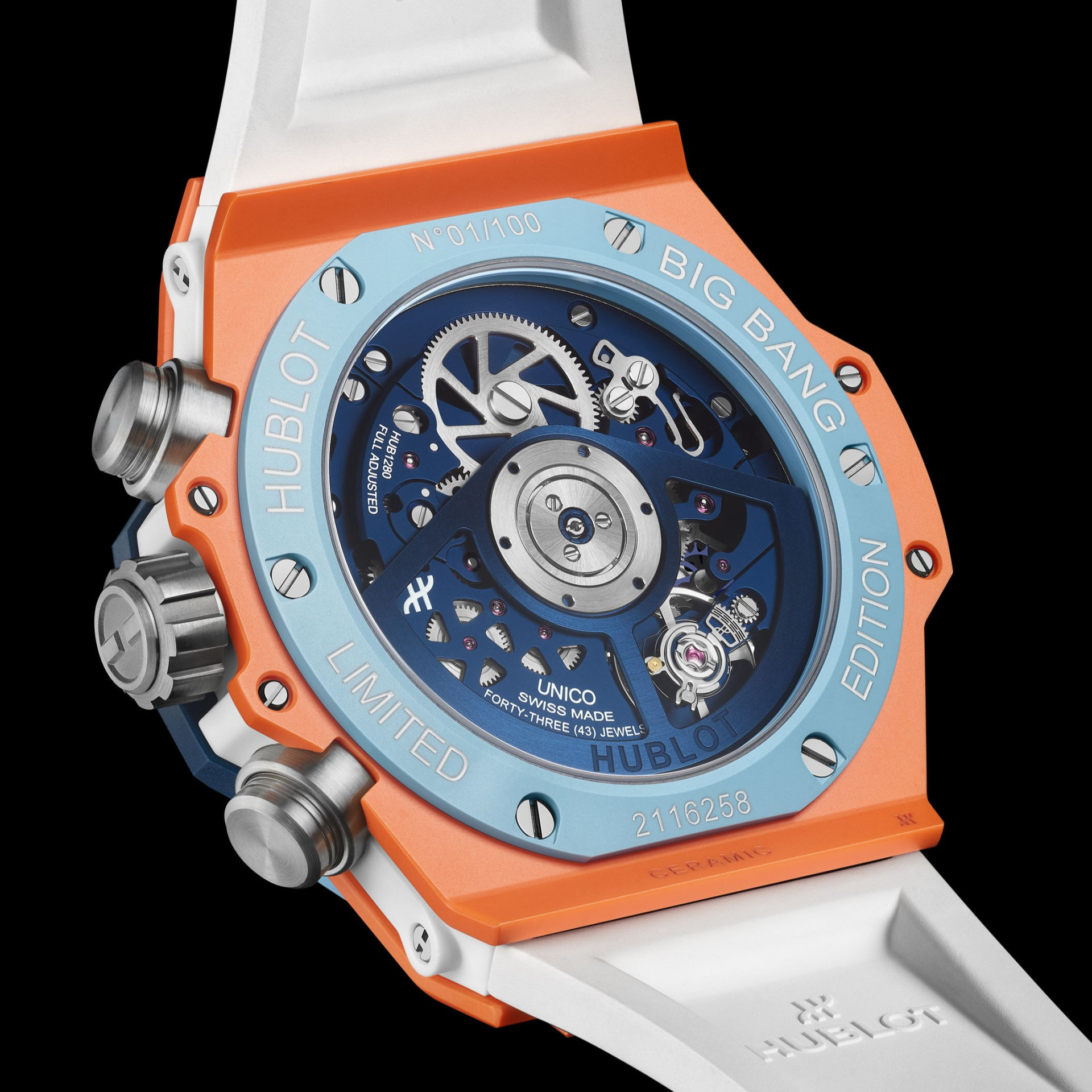 全新腕錶不僅正面以橘色與藍色陶瓷打造出鮮明的對比視覺,錶背同樣展現品牌對細節的極致講究。透過藍色藍寶石透明底蓋可一覽 HUB1280 自製飛返計時機芯的機械美感,深藍色鏤空自動盤與橘藍雙色錶殼形成呼應。底蓋環圈以晴空藍陶瓷打造,鐫刻白色「BIG BANG LIMITED EDITION」與專屬限量編號,不僅強調收藏價值,更標註每一只腕錶的獨特性。從正面耀眼奪目到背面結構層次豐富,完美體現宇舶「融合的藝術」製錶哲學。