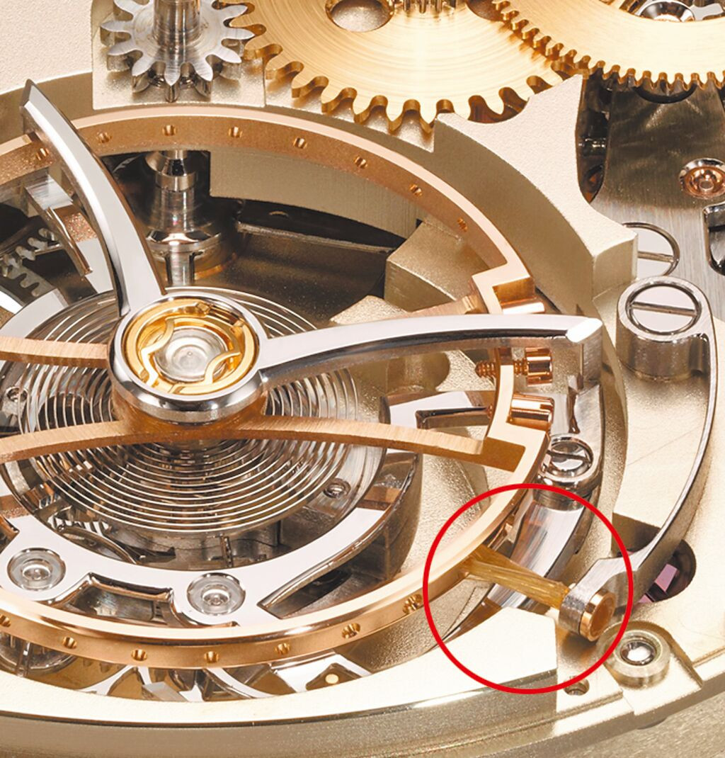 Moritz Grossmann的陀飛輪機芯採用髮束(紅圈處)來停秒。(瑞博品提供)