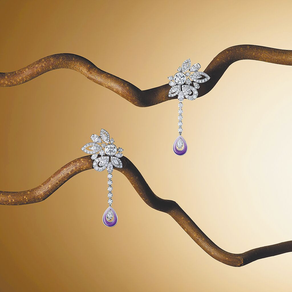 De Beers「Essence of Nature」系列Jacaranda Bloom耳環,讓人聯想到南非藍花楹樹盛開美景。(De Beers提供)
