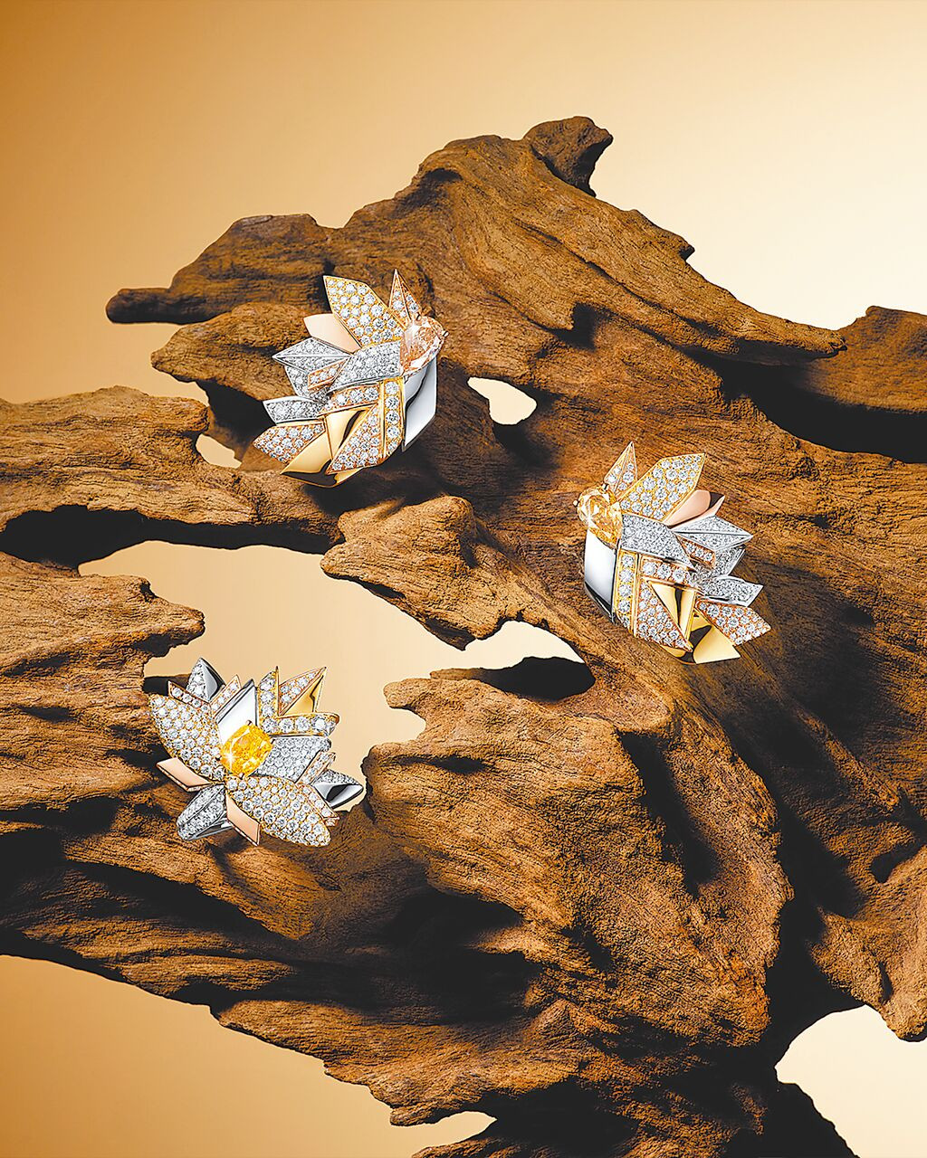 楓樹是加拿大的國樹,De Beers以楓樹為創作靈感,以靈動線條勾勒楓葉獨特的幾何形態,黃K金、白金與玫瑰金巧妙交融,並鑲嵌橘色彩鑽,展現秋天楓紅季節的斑斕景色,超高工藝鑲嵌技巧鋪排白鑽,生動描繪落葉的自然紋理。