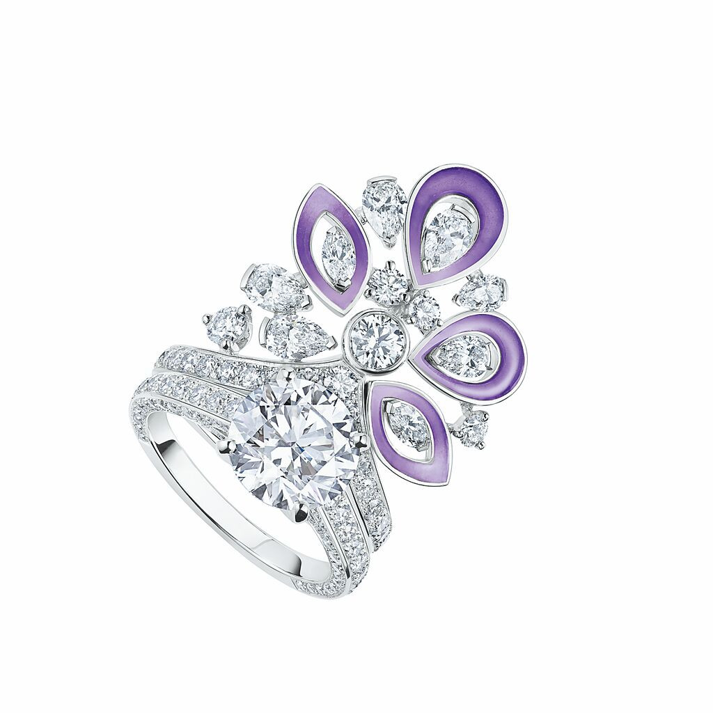 De Beers「Essence of Nature」系列Jacaranda Bloom琺瑯皇冠式戒指。(De Beers提供)