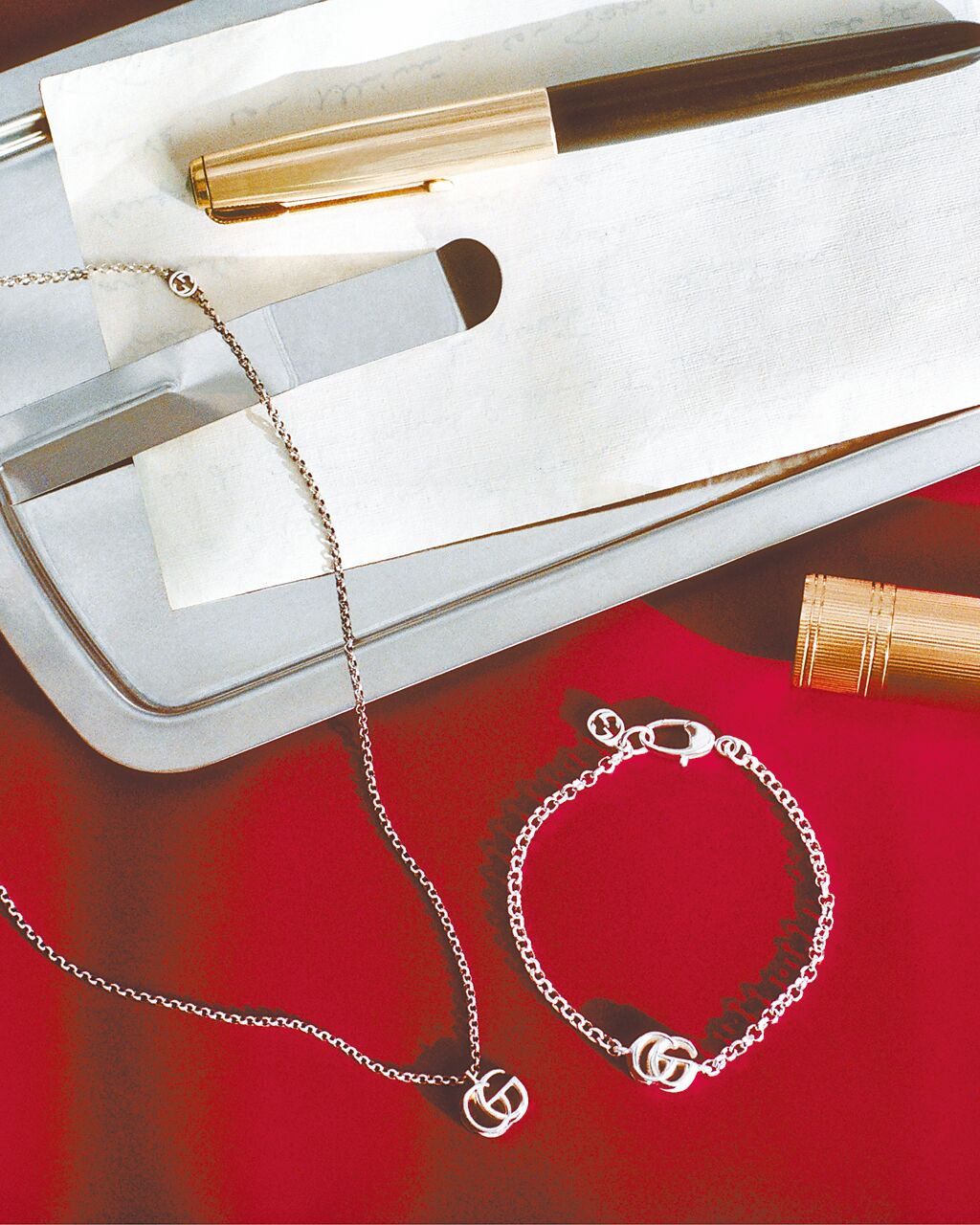 GUCCI銀飾項鍊,1萬3700元;同款手鍊,1萬2400元。(GUCCI提供)