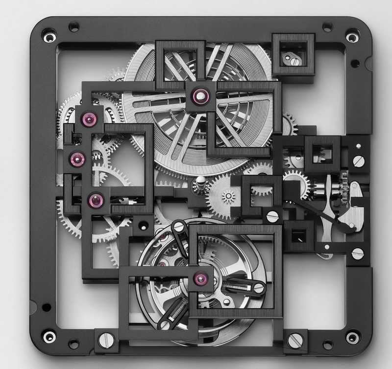 四個主要機構沿著方形四邊分佈:右側為上鍊系統,左側為動力儲存顯示,上方是大型發條盒,下方則是陀飛輪。結構均衡、視覺衝擊強烈,並以鏤空構造展現工程與美學的雙重魅力。