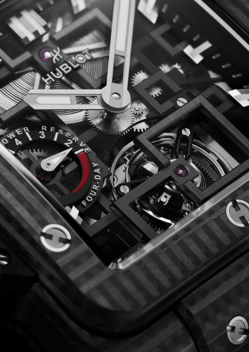 為達成這項全新突破,宇舶專為此錶研發 MHUB6023 手動上鍊鏤空陀飛輪機芯,由 174 枚零件與 25 顆寶石軸承組成,運行頻率為 3Hz(21,600 次/小時),提供長達96 小時(4 日)的穩定動力。機芯橋板全數採用方形與長方形幾何設計,並以霧面與緞面交錯修飾,令層次分明的結構與剛勁線條更加鮮明。核心配置包括: