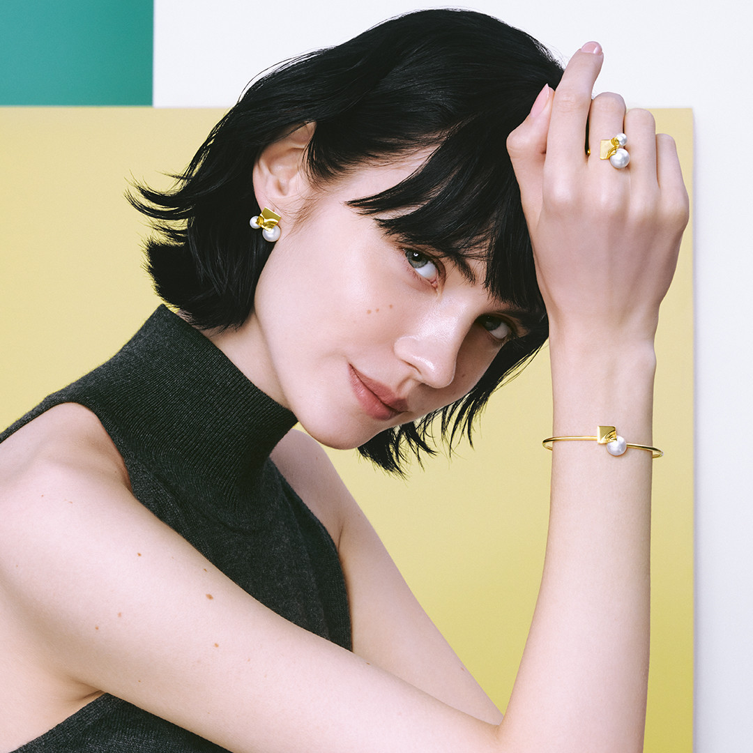SQUARE LEAF 系列為經典優雅注入現代風尚。方形金質元素如飄落的葉片般流暢俐落,搭配一串串瑩潤珍珠,營造出結構感與自然柔美之間的鮮明對比。本季,系列透過不同尺寸的珍珠與俐落方正的金色細節相互呼應,探索幾何之美,呈現銳利線條與柔和曲線間的節奏張力,展現精緻且當代的美學格調。新增開口戒指、手鐲與胸針設計,為日常穿搭增添低調而不費力的閃耀光彩。