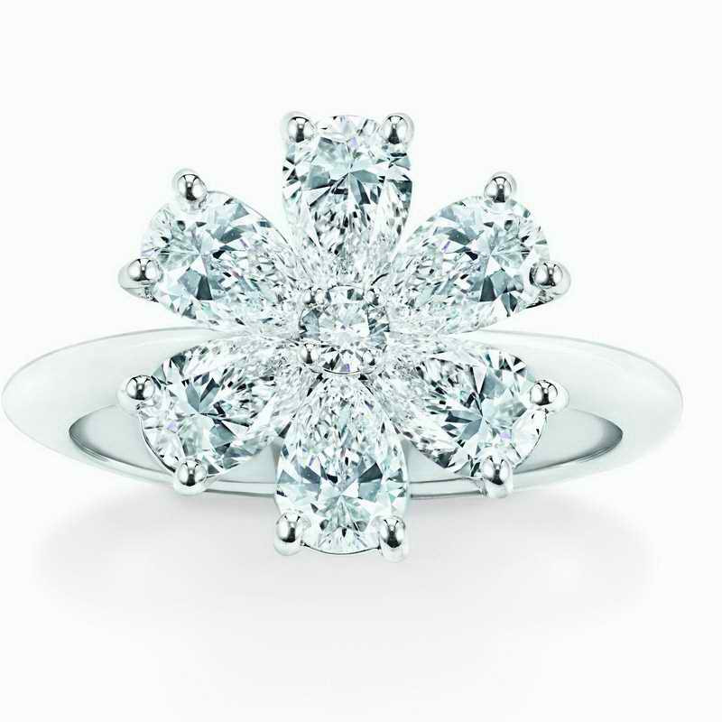 海瑞溫斯頓 勿忘我Forget-Me-Not系列鑽石戒指以6顆水滴型切工鑽石及1顆圓形明亮式切工鑽石,悉心鑲嵌於鉑金底座。