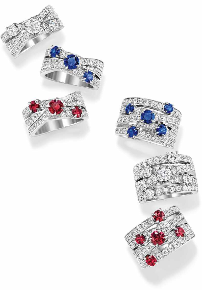 海瑞溫斯頓Crossover系列藍寶石鑽石戒指以現代風格詮釋品牌哲學——將每一顆鑽石的璀璨光彩盡致發揮。以藍寶石與鑽石蜿蜒重疊出5圈富有藝術氣息的圓環線條。戒指以5顆總重約1.18克拉的藍寶石,60顆總重約1.11克拉的圓形明亮式切工鑽石,悉心鑲嵌於鉑金底座。