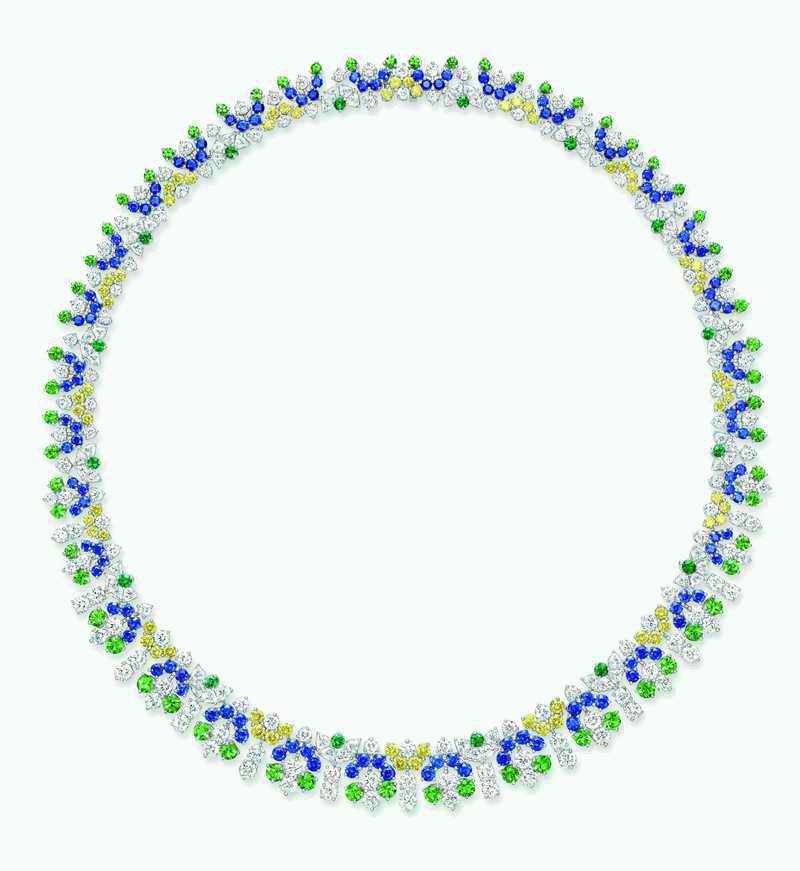New York系列Manhattan Adornment項鍊以16顆圓形明亮式切工祖母綠,64顆圓形明亮式切工沙弗萊石,64顆圓形明亮式切工黃鑽,搭配128顆圓形明亮式切工藍寶石和203顆圓形明亮式與三角形切工的鑽石,悉心鑲嵌於鉑金底座。