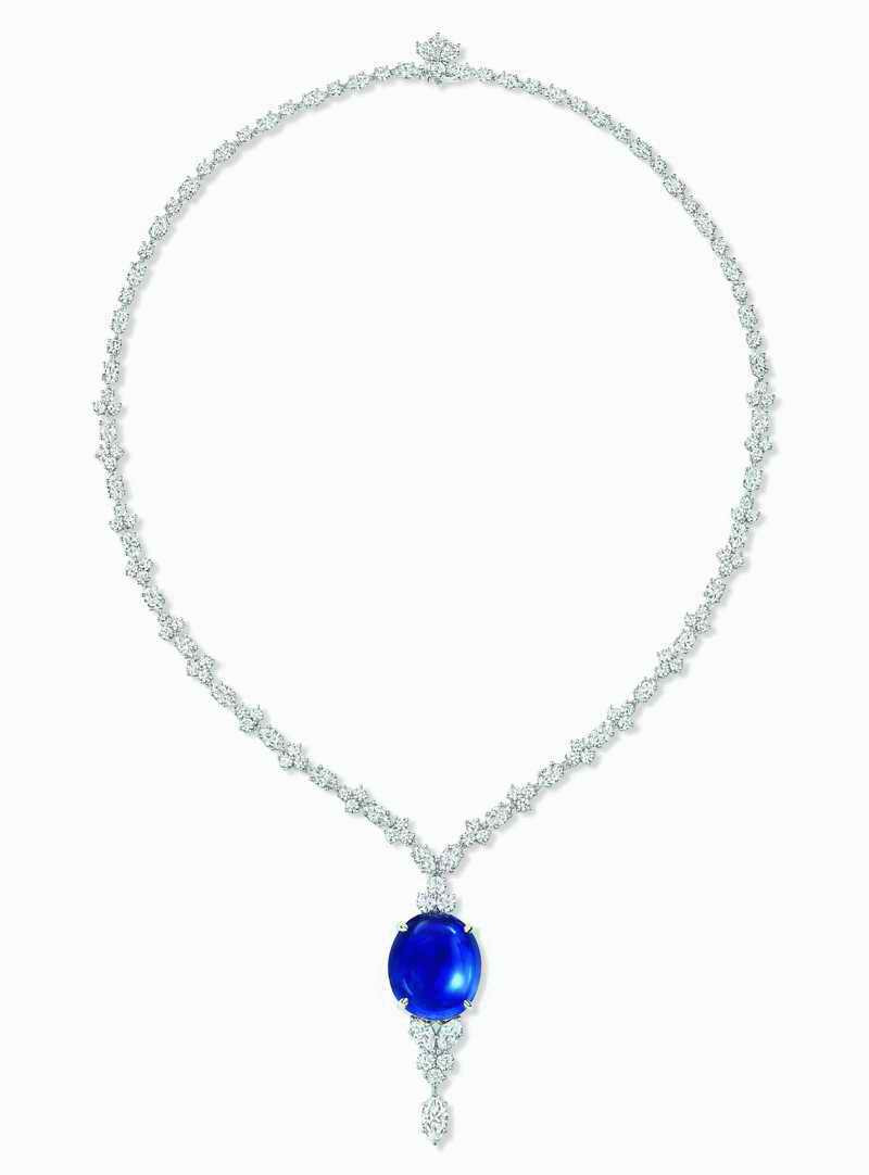 海瑞溫斯頓頂級珠寶系列藍寶石鑽石項鍊,以總重約58.69克拉的蛋面型切工藍寶石與鑽石,悉心鑲嵌與鉑金底座。