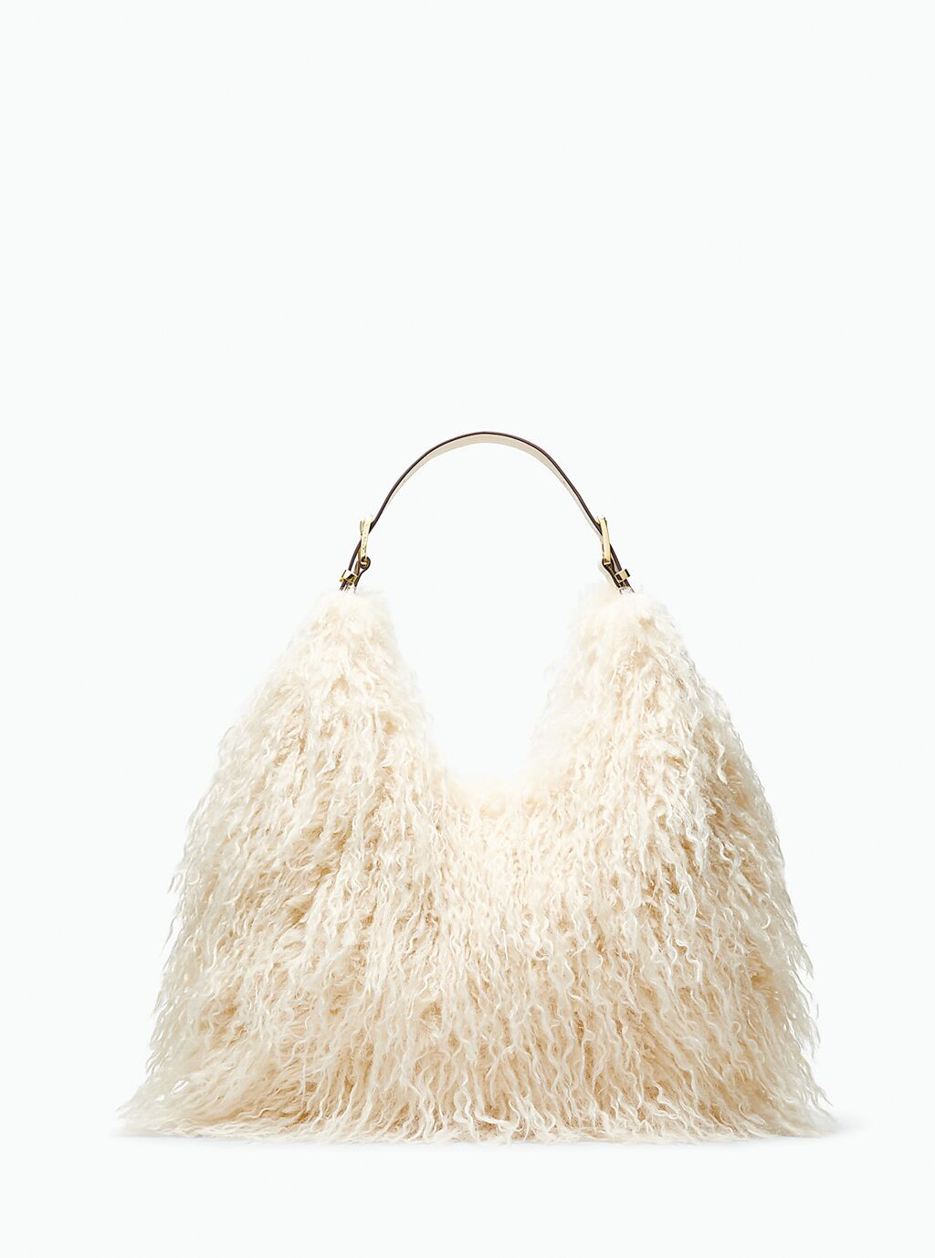 MICHAEL KORS台北101獨家,Nolita白色絨毛大型肩背包,2萬4200元。(Michael Kors提供)