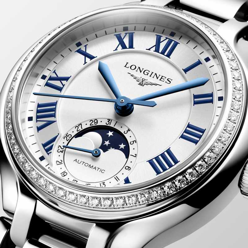全新新月系列首次配置自動月相複雜功能和結合實用的日期顯示功能,並由浪琴表獨家L899.5自動上鏈機芯負責驅動,和採用矽游絲技術打造卓越性能,可提供約達 72 小時動力儲存,確保在未佩戴時,能長時間保持穩定的走時,防水深度達 3 巴(30米)。每只新月系列腕錶以精緻的尺寸比例展現瑞士鐘錶工藝的可靠性,同時兼顧女性腕錶的優雅氣質。矽游絲技術提升精準度,並帶來絕佳的抗磁性及承受溫度變化能力,確保持續精準計時。