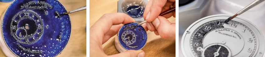 琺瑯錶盤向來被視為製錶工藝中最為複雜的工藝之一,通過複雜細緻的工序賦予錶盤迷人的立體感,令刻字呈現鮮明對比,美觀之外亦更為耐用。朗格工匠以超過 800°C 的高溫,反覆燒製多層琺瑯從而達到所需厚度。此外,每層琺瑯亦需單獨燒製,而在每一次的燒製過程中,都可能出現裂紋、氣泡或細微雜質,因此過程中的每個工序都需精準細緻,方能成就平滑無瑕的錶盤表面。由於製程耗時數日且成功率極低,目前只有極少數專家掌握這種複雜工藝,而朗格工匠就是其中之一。因此,配備琺瑯錶盤的腕錶十分稀有。自 2000 年起,朗格已推出 10 款限量發行的琺瑯錶盤時計, 皆是鐘錶愛好者夢寐以求的收藏佳品。
